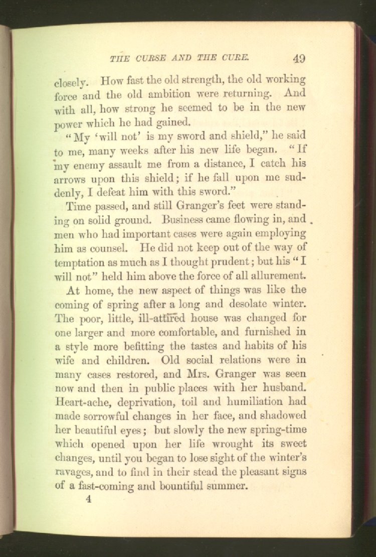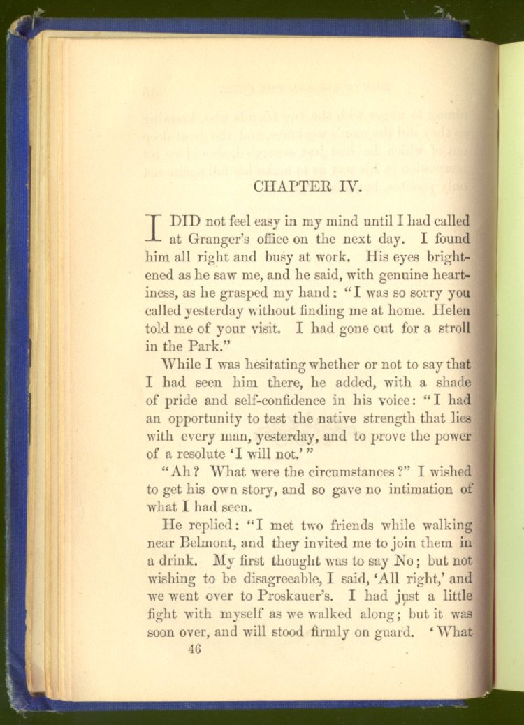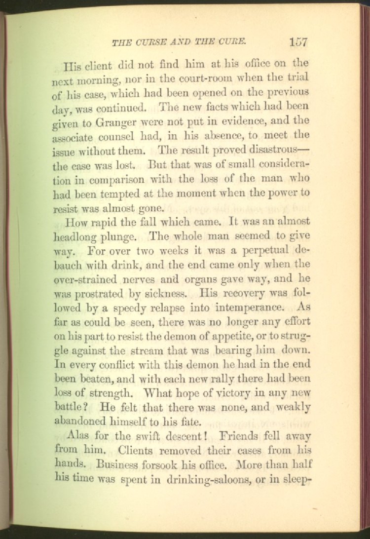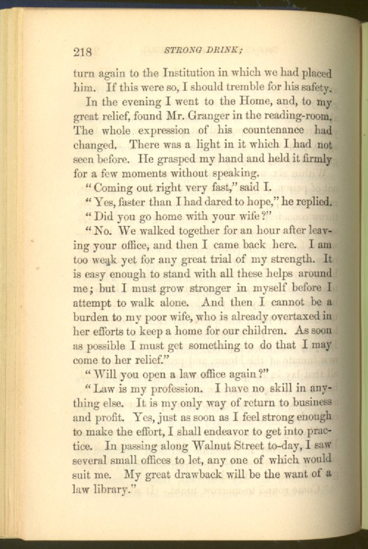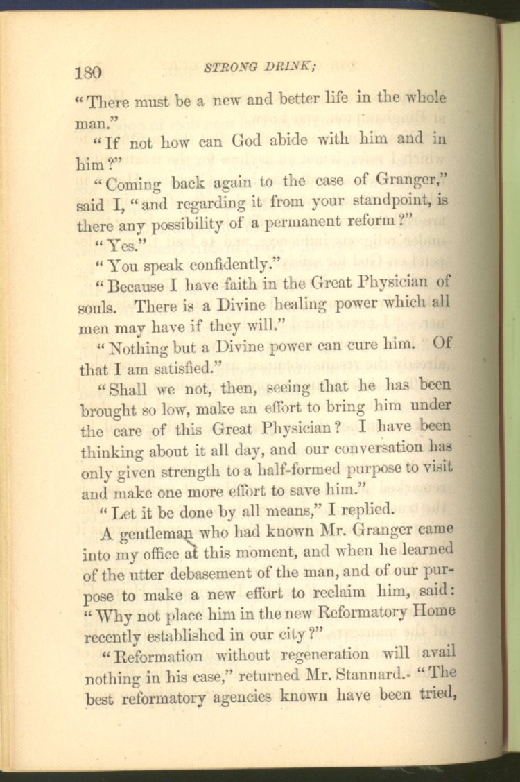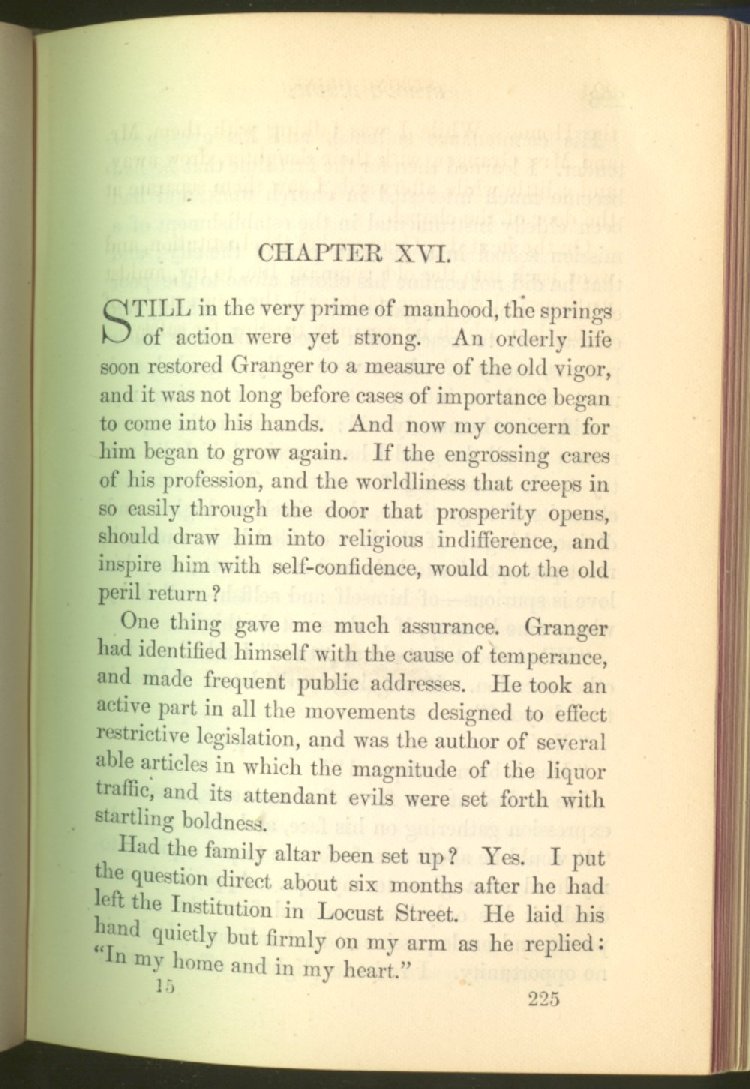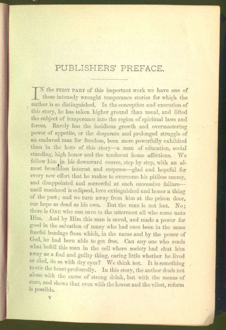of this important work we have one of those intensely wrought temperance stories for which the author is so distinguished. In the conception and execution of this story, he has taken higher ground than usual, and lifted the subject of temperance into the region of spiritual laws and forces. Rarely has the insidious growth and overmastering power of appetite, or the desperate and prolonged struggle of an enslaved man for freedom, been more powerfully exhibited than in the hero of this story--a man of education, social standing, high honor and the tenderest home affections. We follow him in his downward course, step by step, with an almost breathless interest and suspense--glad and hopeful for every new effort that he makes to overcome his pitiless enemy, and disappointed and sorrowful at each successive failure--until manhood is eclipsed, love extinguished and honor a thing of the past; and we turn away from him at the prison door, our hope as dead as his own. But the man is not lost. No; there is O