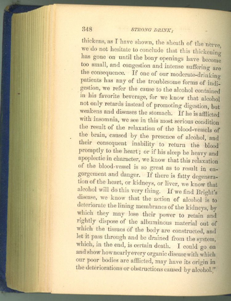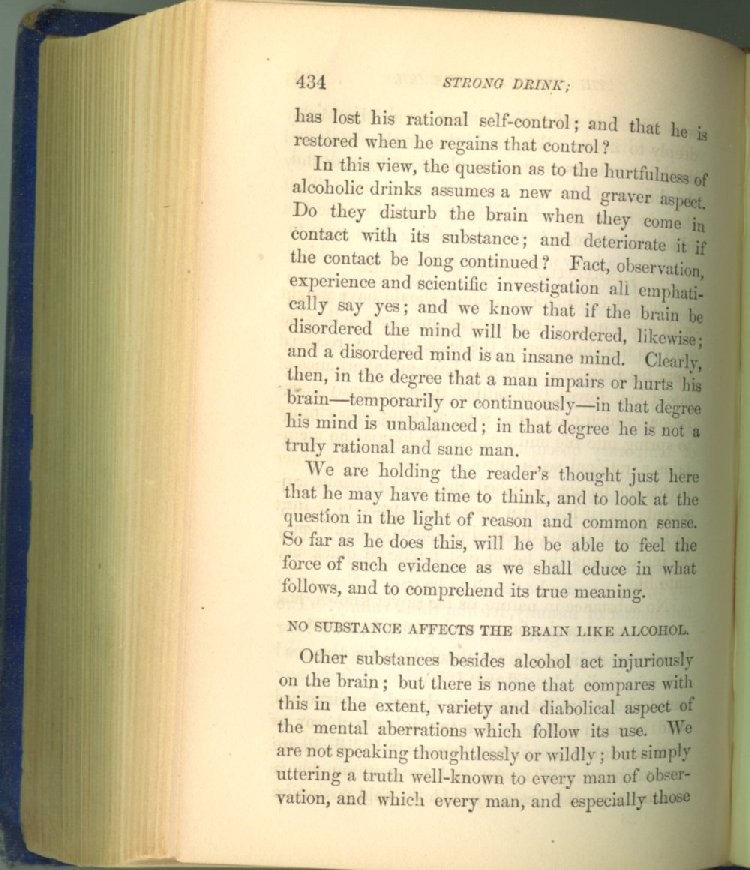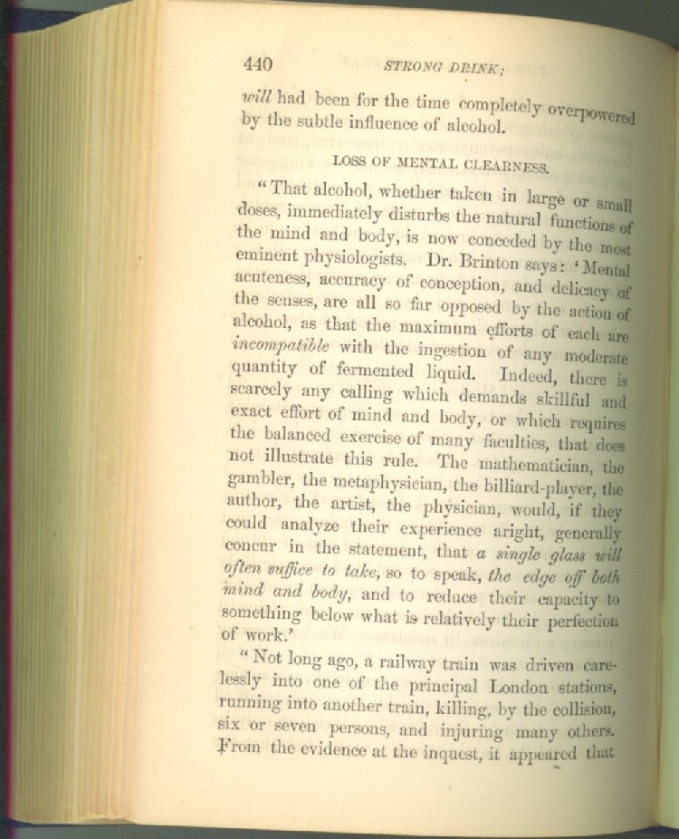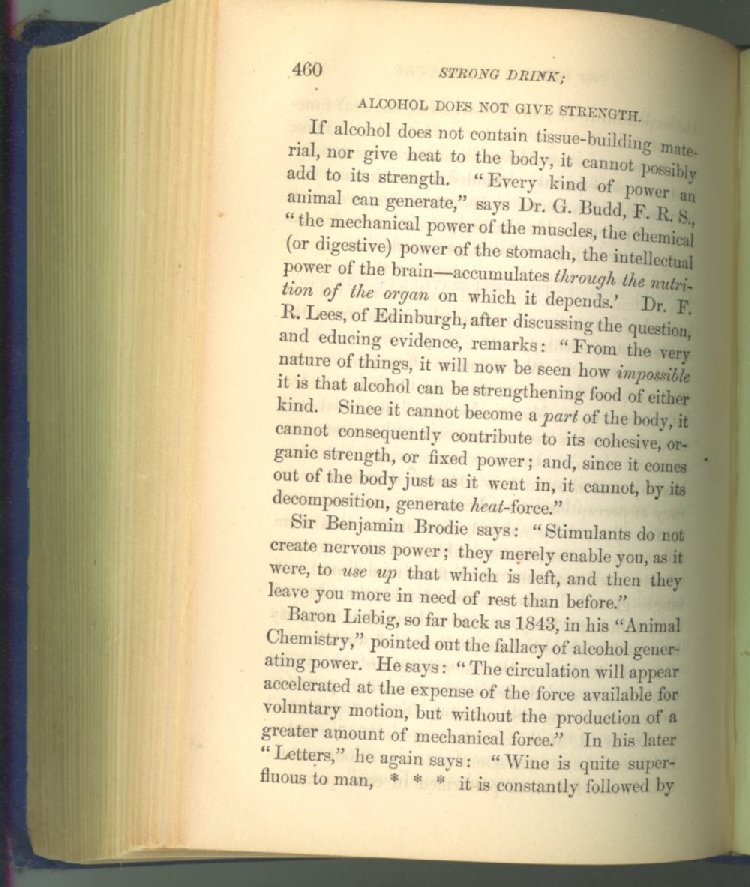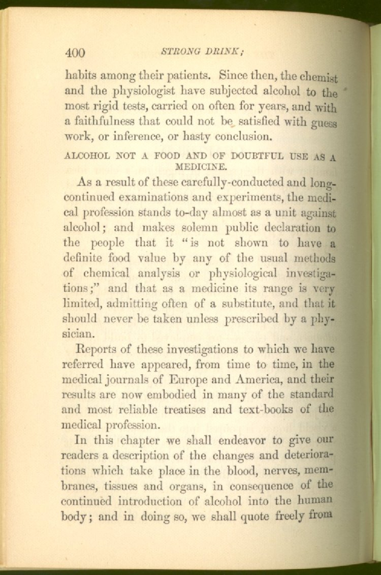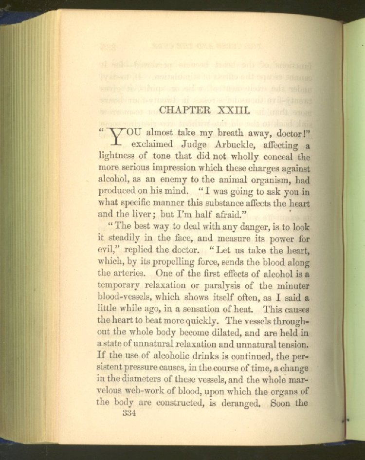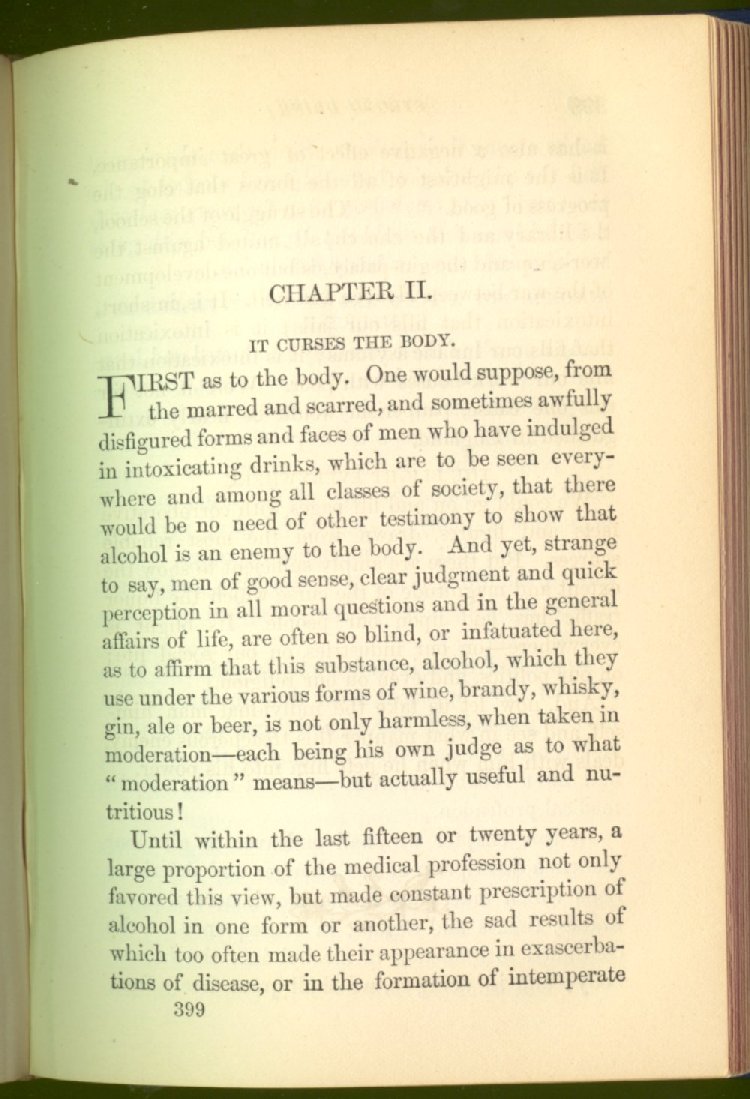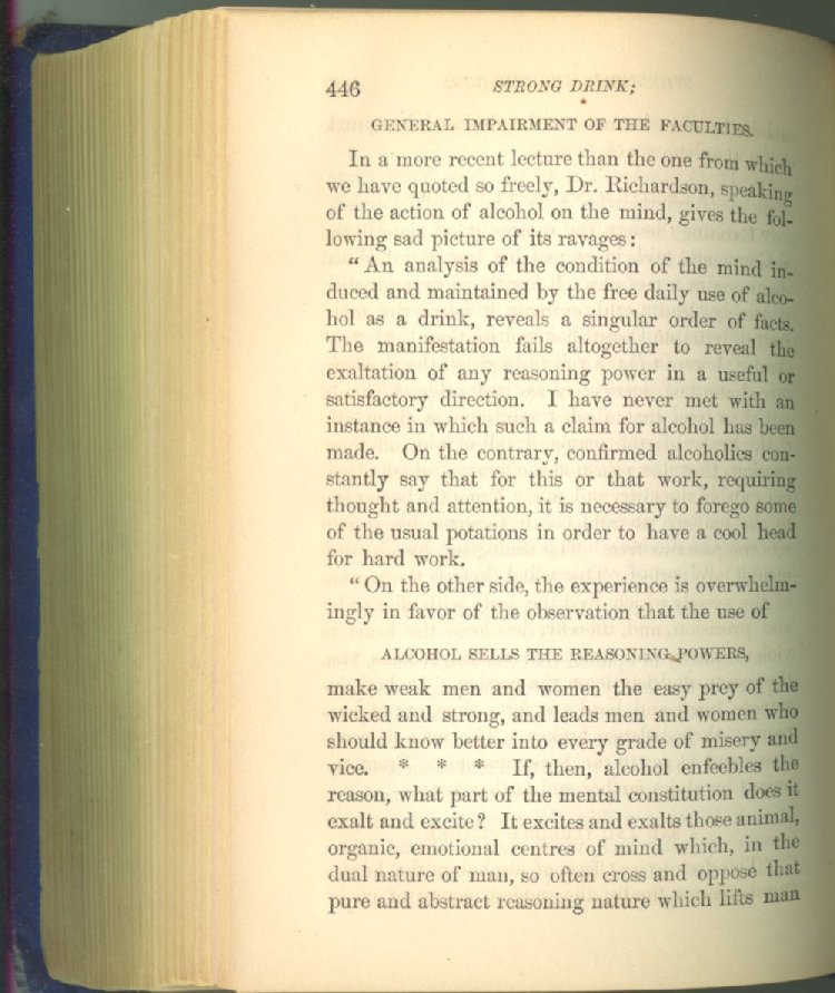 that he addresses himself to the more serious purpose of his work. It is because the majority of the people are ignorant of the specific action of alcohol on the nerves, membranes, blood-vessels and vital organs, that so many indulge in its use. Under this head he gives the latest and most carefully-conducted experiments of physiologists and scientists, from which it has been clearly demonstrated that alcohol invariably acts as a poison when taken into the body, and that its habitual use always lays the foundation for disease, often of a fatal character. This chapter is a most important one, and should be read by every young man, and by every moderate drinker in the land. Its well-authenticated statement cannot fail to arrest the reader's attention, and deeply impress him with the dangers that always attend the use of alcoholic drinks. It is also shown how mental failure always keeps pace with the physical deteriorations which attend the regular drinking of alcoholic beverages; that no man can do his best, mentally or physically, while under their influence, and that their continued use steadily lessens the intellectual vigor and blunts the moral faculties.