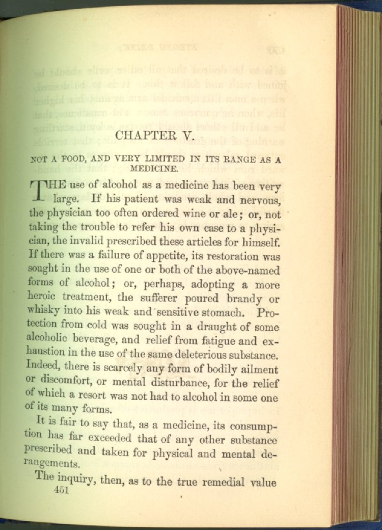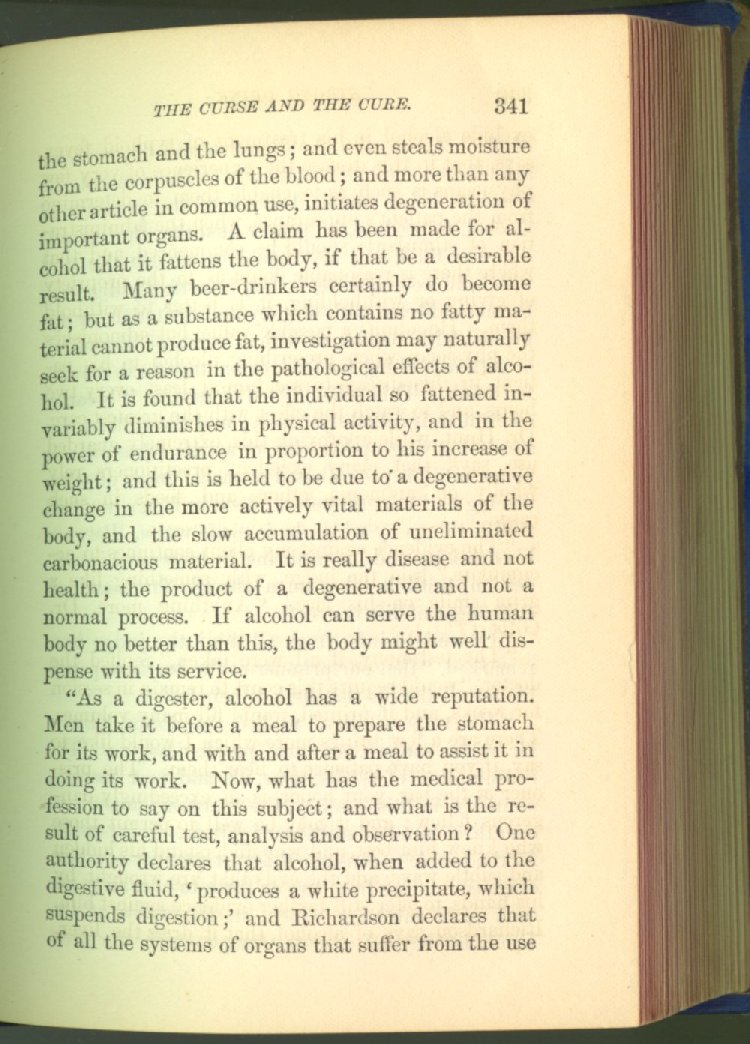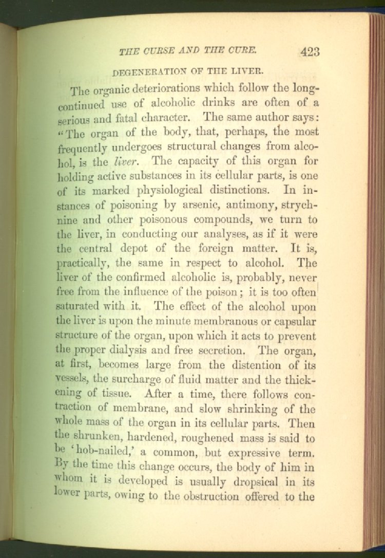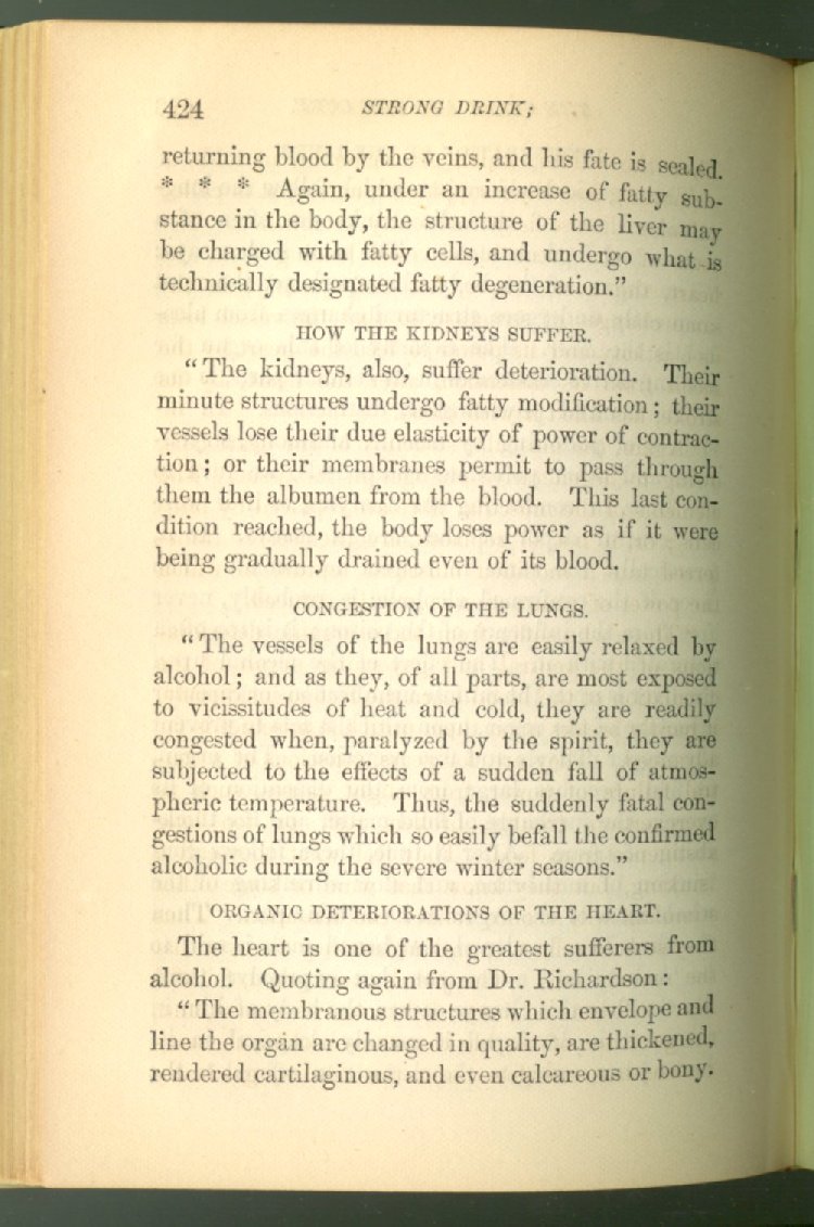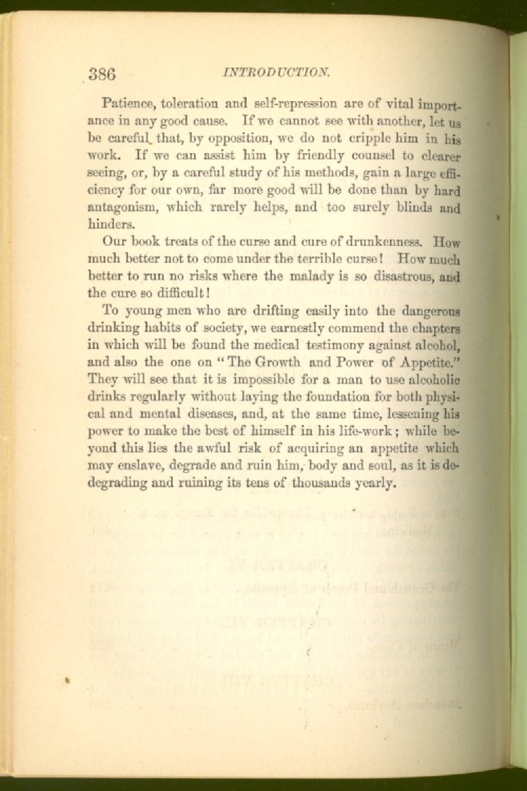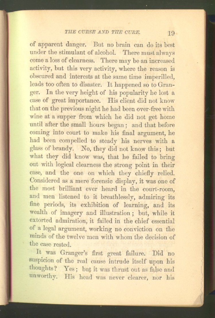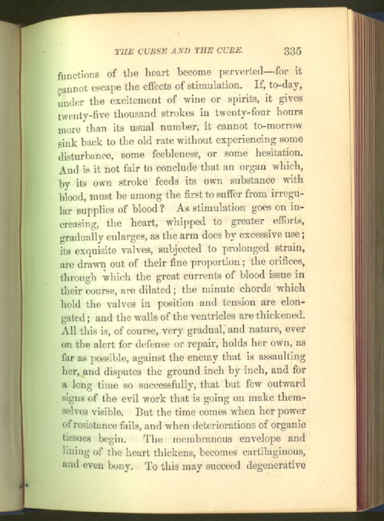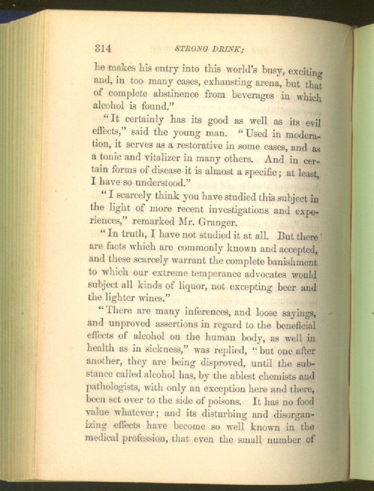 that he addresses himself to the more serious purpose of his work. It is because the majority of the people are ignorant of the specific action of alcohol on the nerves, membranes, blood-vessels and vital organs, that so many indulge in its use. Under this head he gives the latest and most carefully-conducted experiments of physiologists and scientists, from which it has been clearly demonstrated that alcohol invariably acts as a poison when taken into the body, and that its habitual use always lays the foundation for disease, often of a fatal character. This chapter is a most important one, and should be read by every young man, and by every moderate drinker in the land. Its well-authenticated statement cannot fail to arrest the reader's attention, and deeply impress him with the dangers that always attend the use of alcoholic drinks. It is also shown how mental failure always keeps pace with the physical deteriorations which attend the regular drinking of alcoholic beverages; that no man can do his best, mentally or physically, while under their influence, and that their continued use steadily lessens the intellectual vigor and blunts the moral faculties.