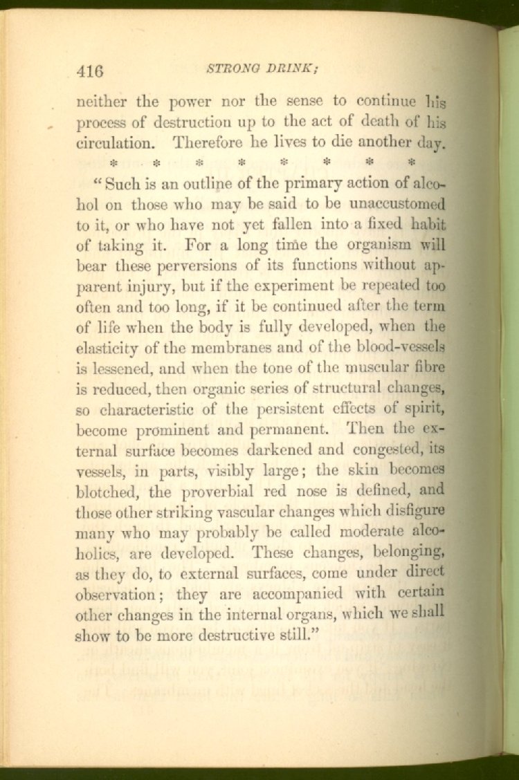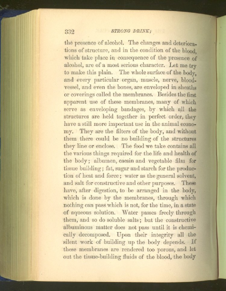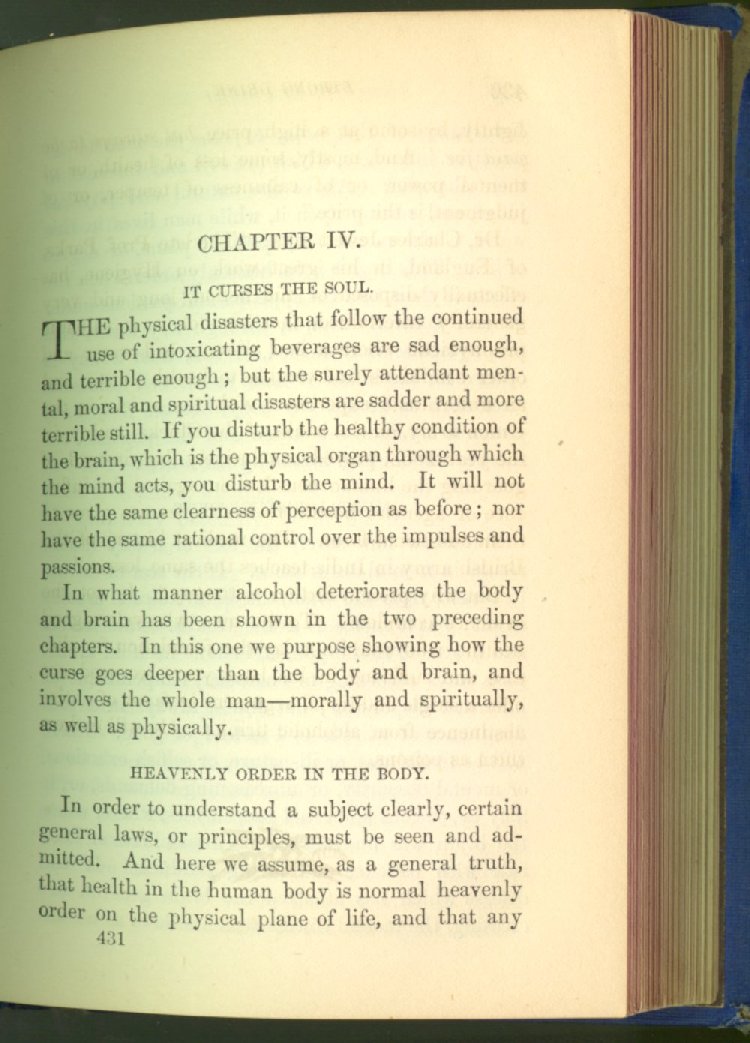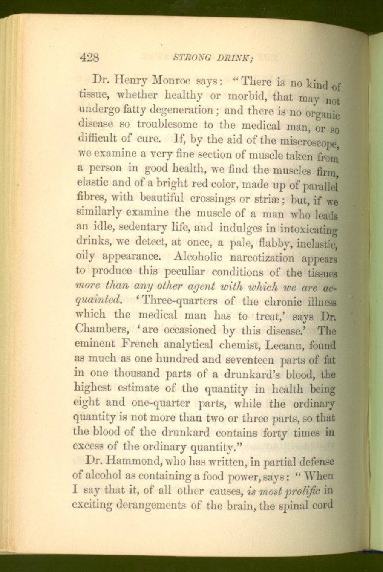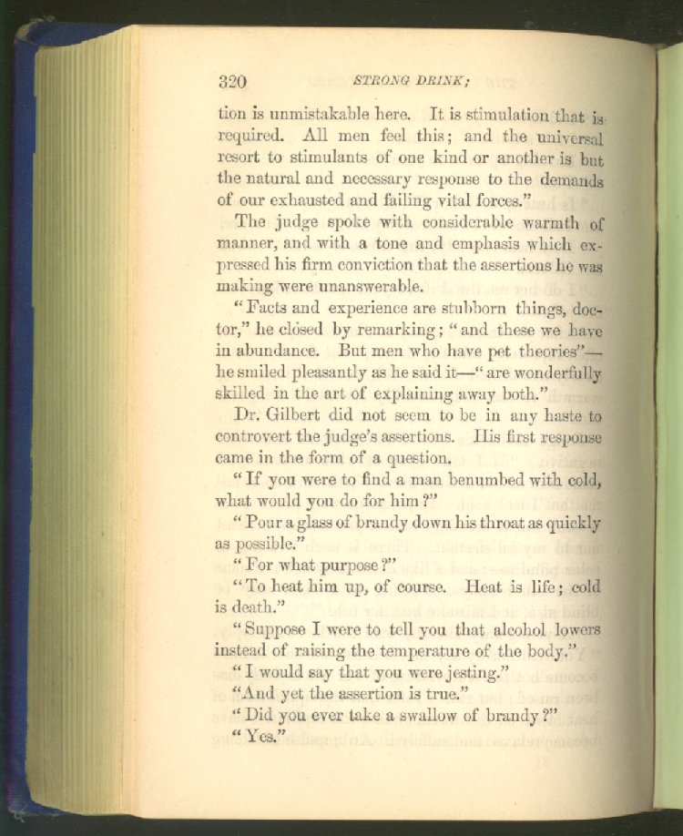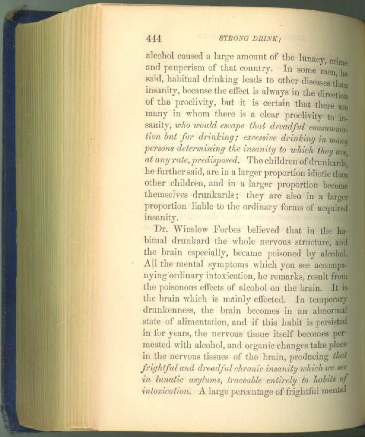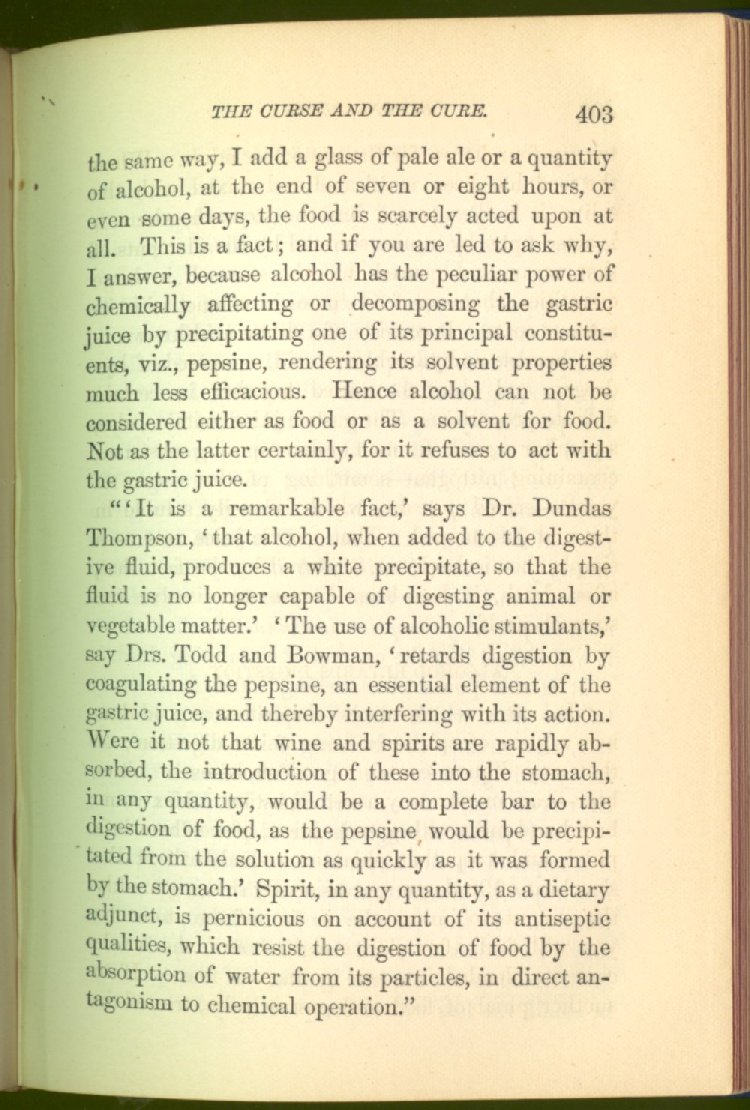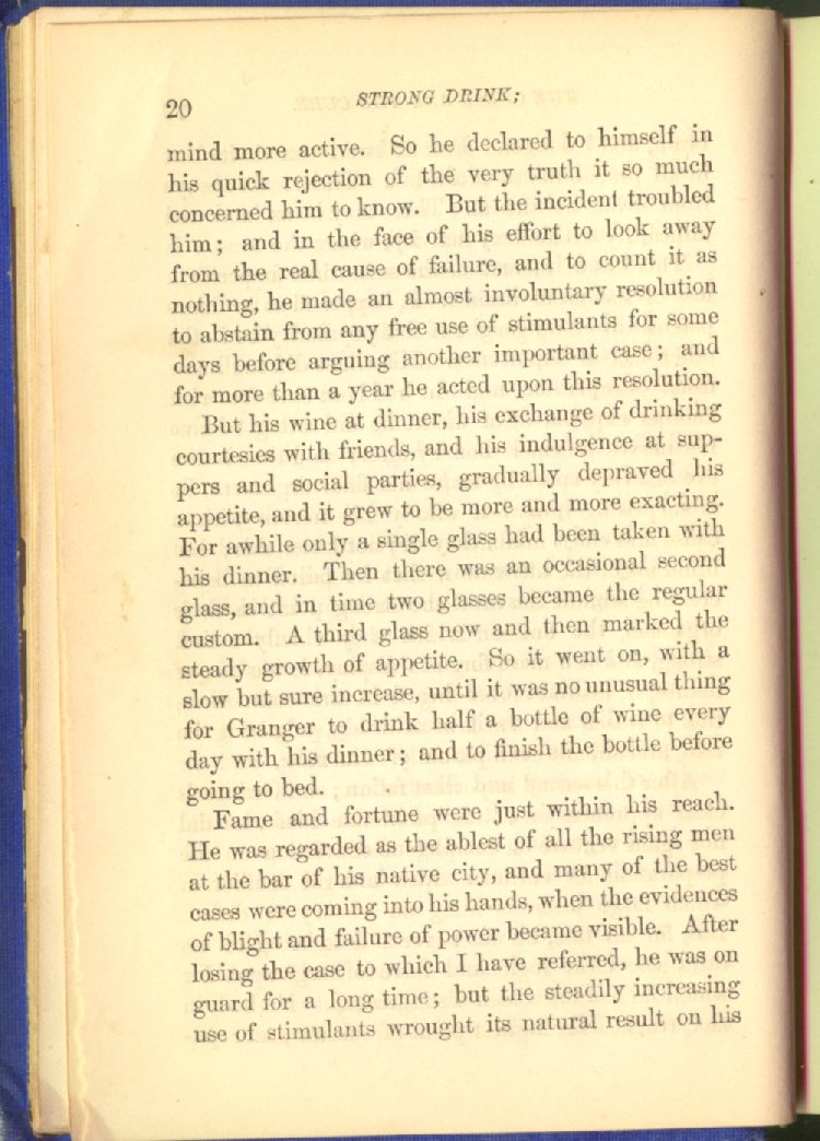 that he addresses himself to the more serious purpose of his work. It is because the majority of the people are ignorant of the specific action of alcohol on the nerves, membranes, blood-vessels and vital organs, that so many indulge in its use. Under this head he gives the latest and most carefully-conducted experiments of physiologists and scientists, from which it has been clearly demonstrated that alcohol invariably acts as a poison when taken into the body, and that its habitual use always lays the foundation for disease, often of a fatal character. This chapter is a most important one, and should be read by every young man, and by every moderate drinker in the land. Its well-authenticated statement cannot fail to arrest the reader's attention, and deeply impress him with the dangers that always attend the use of alcoholic drinks. It is also shown how mental failure always keeps pace with the physical deteriorations which attend the regular drinking of alcoholic beverages; that no man can do his best, mentally or physically, while under their influence, and that their continued use steadily lessens the intellectual vigor and blunts the moral faculties.