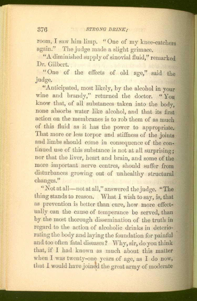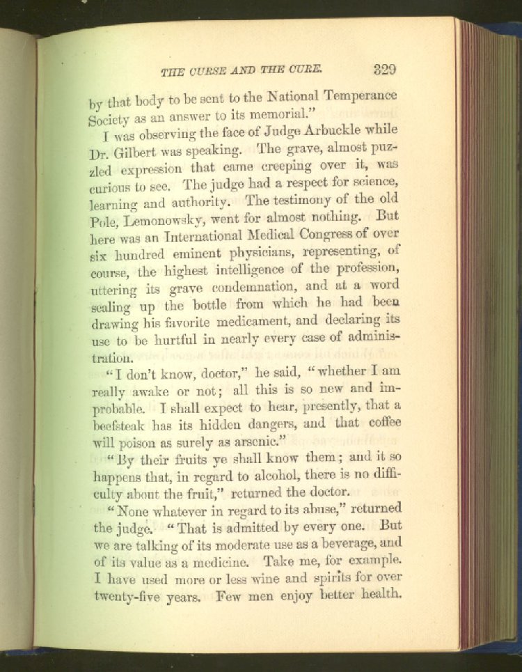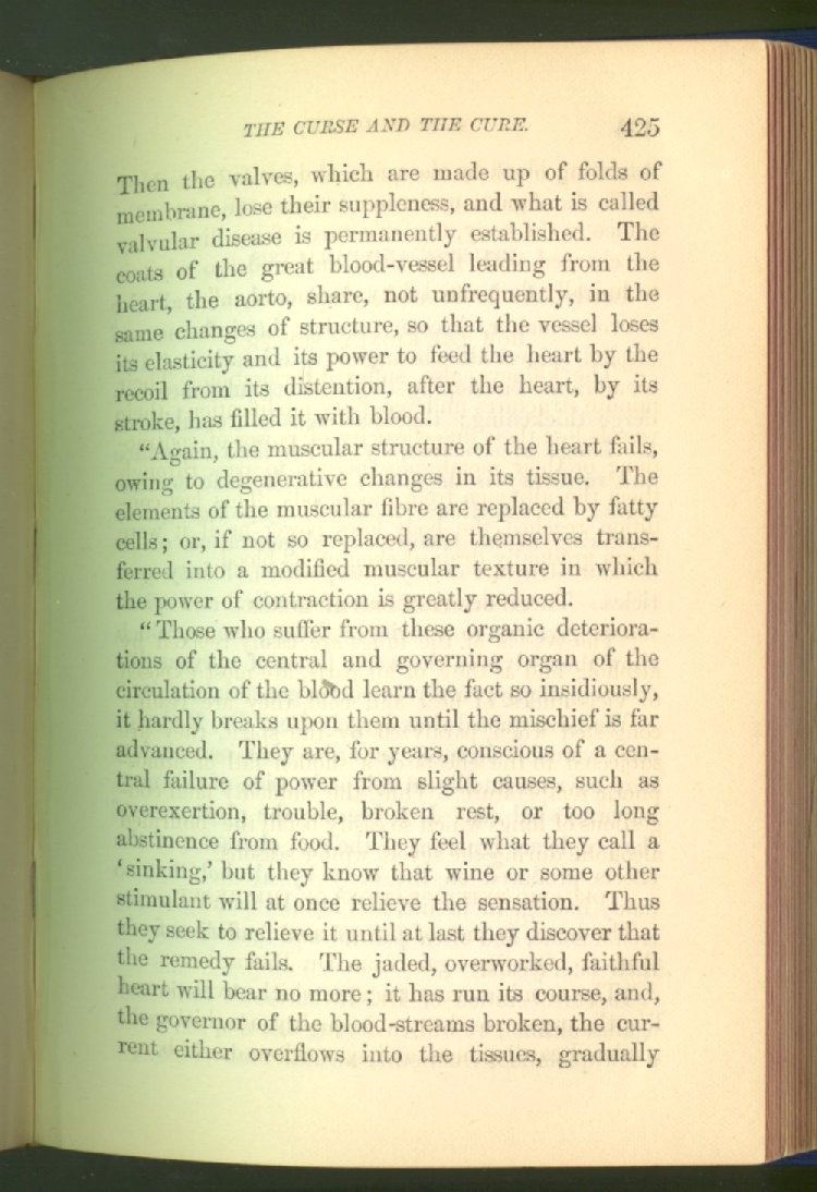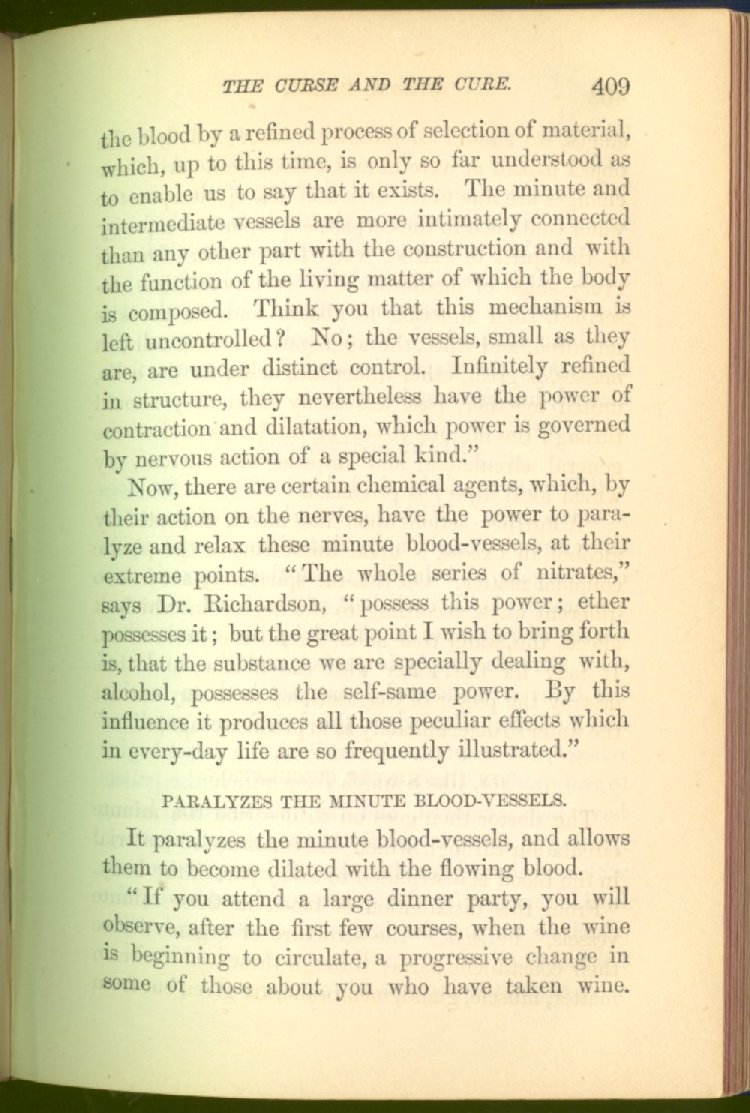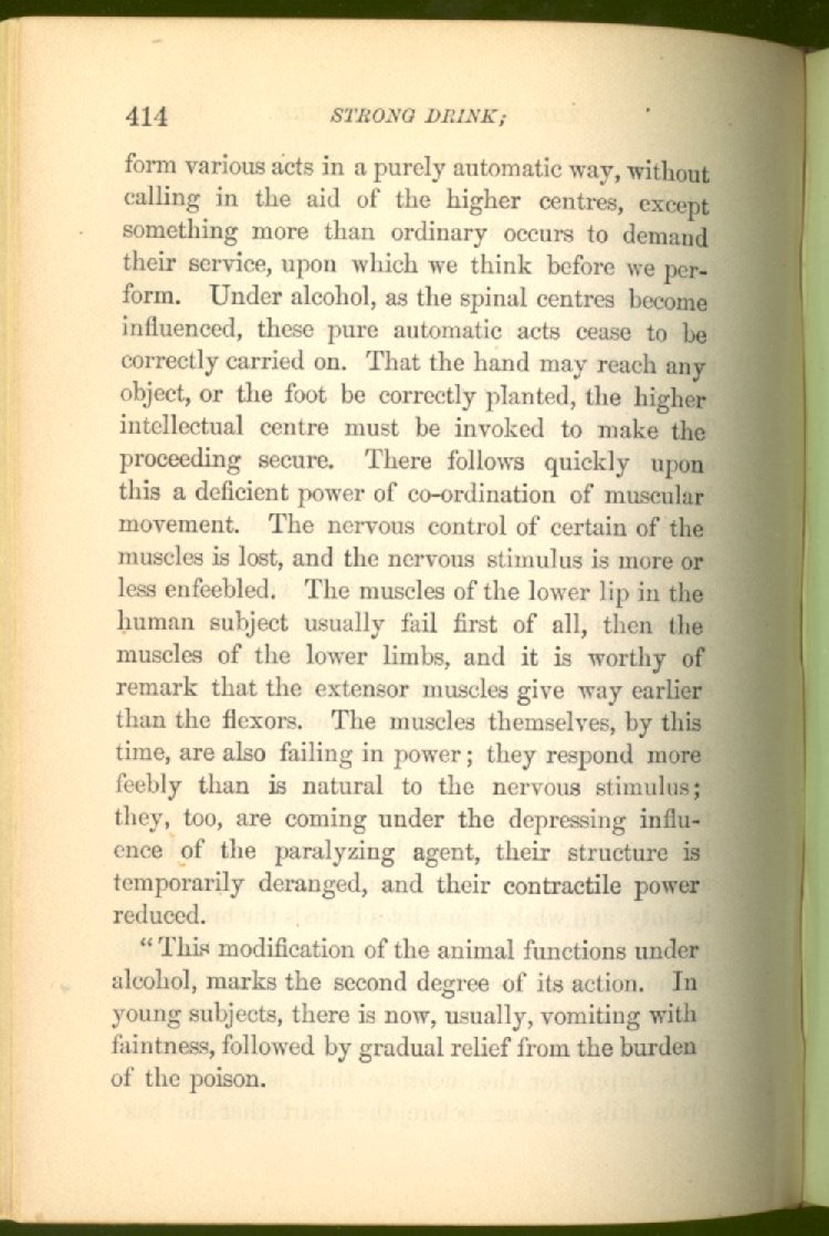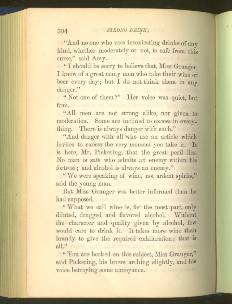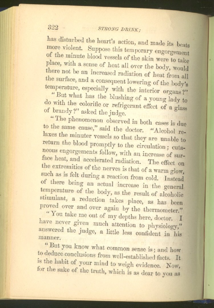 that he addresses himself to the more serious purpose of his work. It is because the majority of the people are ignorant of the specific action of alcohol on the nerves, membranes, blood-vessels and vital organs, that so many indulge in its use. Under this head he gives the latest and most carefully-conducted experiments of physiologists and scientists, from which it has been clearly demonstrated that alcohol invariably acts as a poison when taken into the body, and that its habitual use always lays the foundation for disease, often of a fatal character. This chapter is a most important one, and should be read by every young man, and by every moderate drinker in the land. Its well-authenticated statement cannot fail to arrest the reader's attention, and deeply impress him with the dangers that always attend the use of alcoholic drinks. It is also shown how mental failure always keeps pace with the physical deteriorations which attend the regular drinking of alcoholic beverages; that no man can do his best, mentally or physically, while under their influence, and that their continued use steadily lessens the intellectual vigor and blunts the moral faculties.