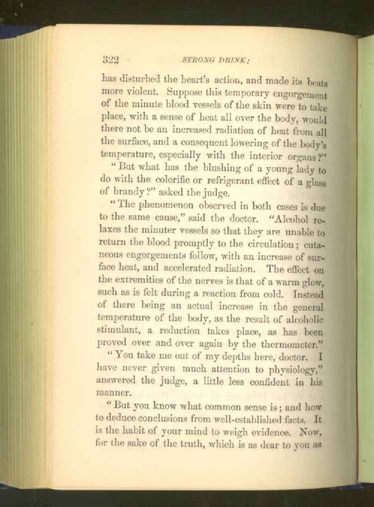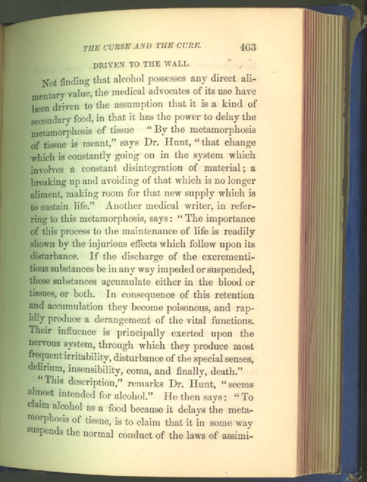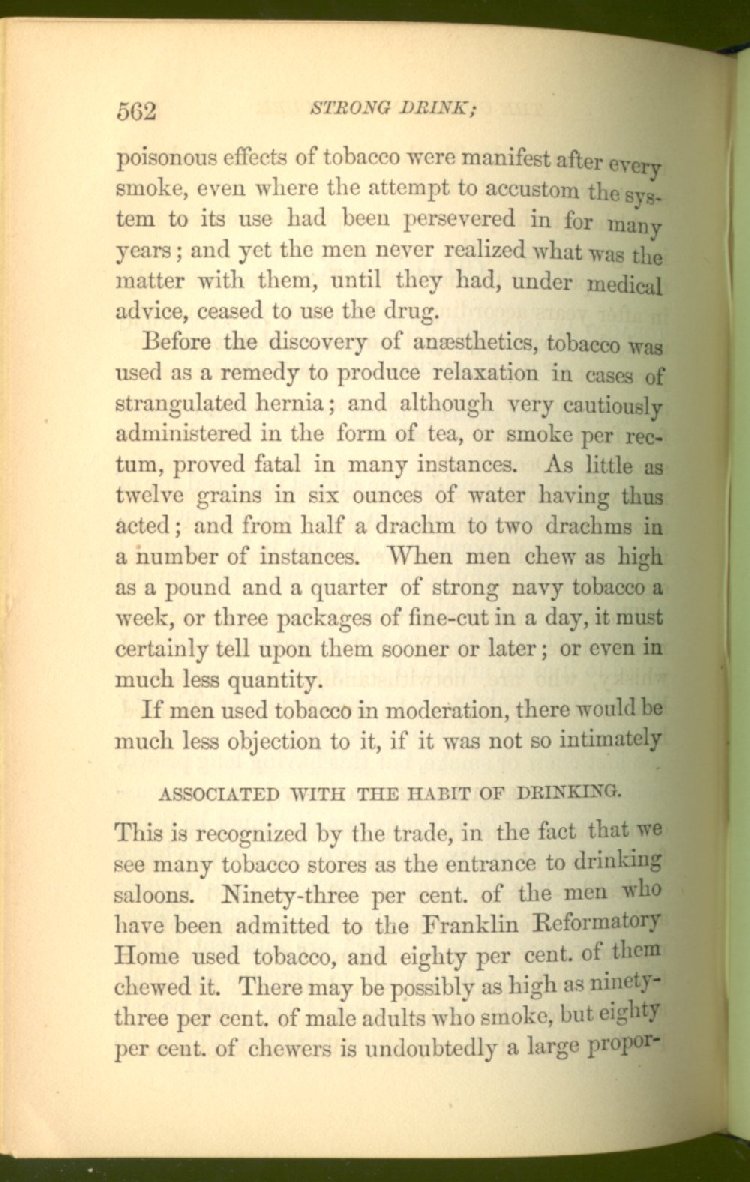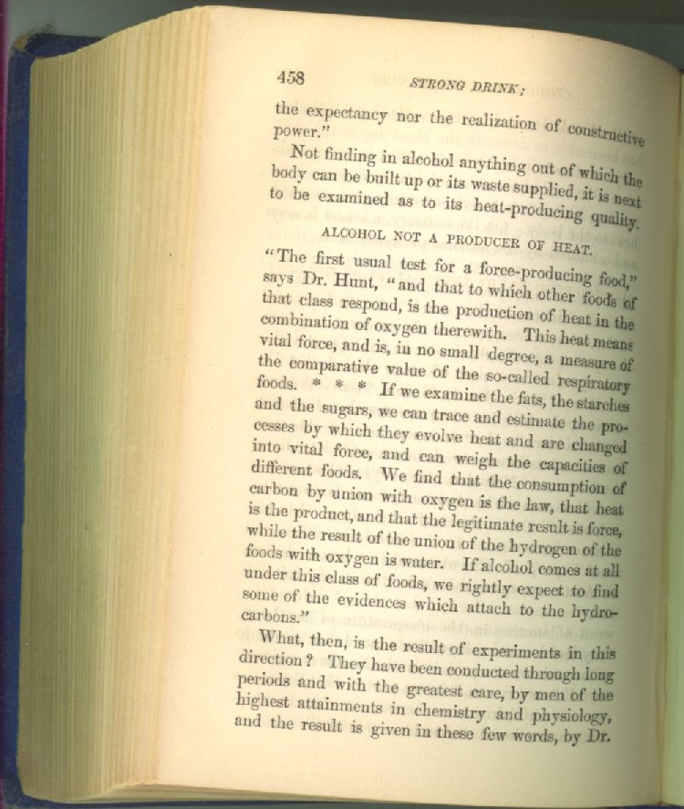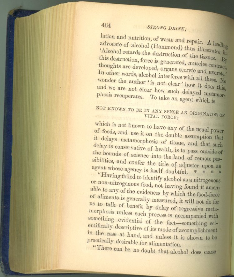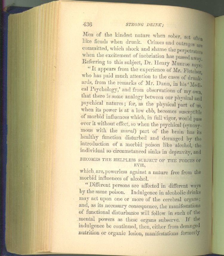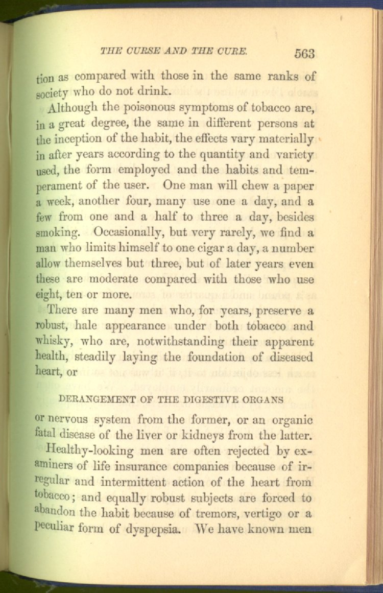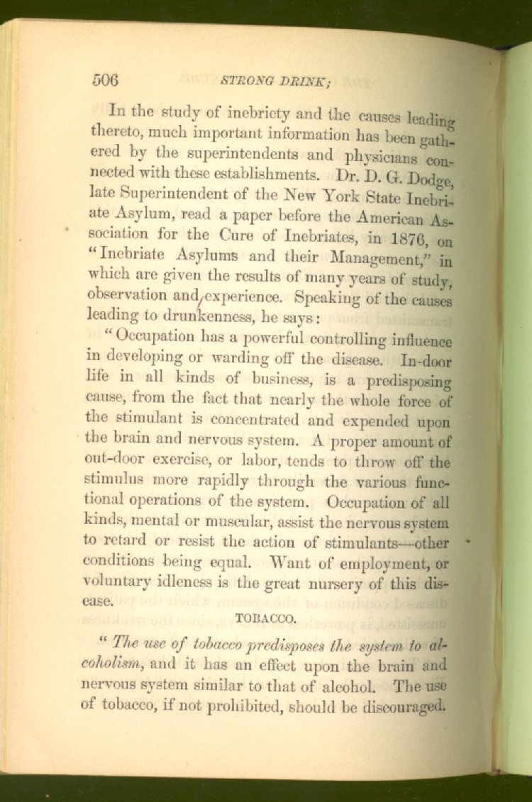 that he addresses himself to the more serious purpose of his work. It is because the majority of the people are ignorant of the specific action of alcohol on the nerves, membranes, blood-vessels and vital organs, that so many indulge in its use. Under this head he gives the latest and most carefully-conducted experiments of physiologists and scientists, from which it has been clearly demonstrated that alcohol invariably acts as a poison when taken into the body, and that its habitual use always lays the foundation for disease, often of a fatal character. This chapter is a most important one, and should be read by every young man, and by every moderate drinker in the land. Its well-authenticated statement cannot fail to arrest the reader's attention, and deeply impress him with the dangers that always attend the use of alcoholic drinks. It is also shown how mental failure always keeps pace with the physical deteriorations which attend the regular drinking of alcoholic beverages; that no man can do his best, mentally or physically, while under their influence, and that their continued use steadily lessens the intellectual vigor and blunts the moral faculties.