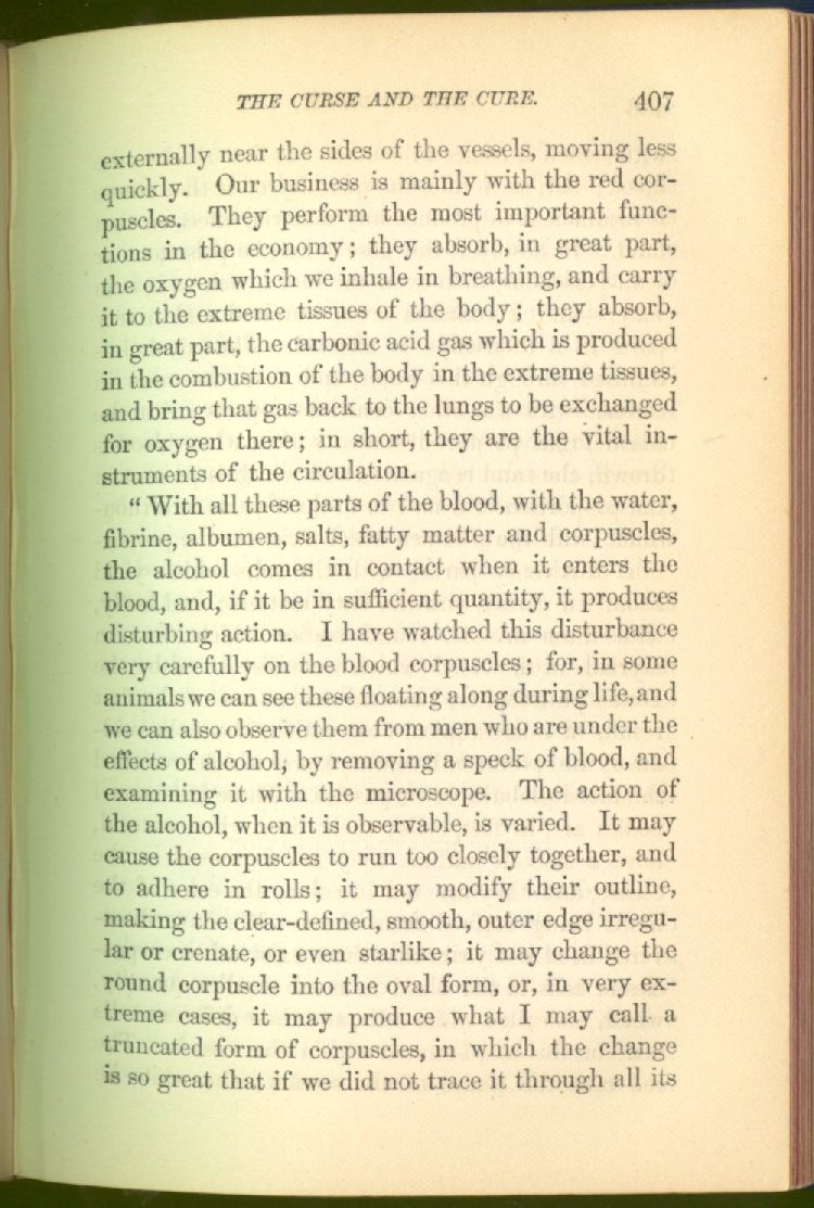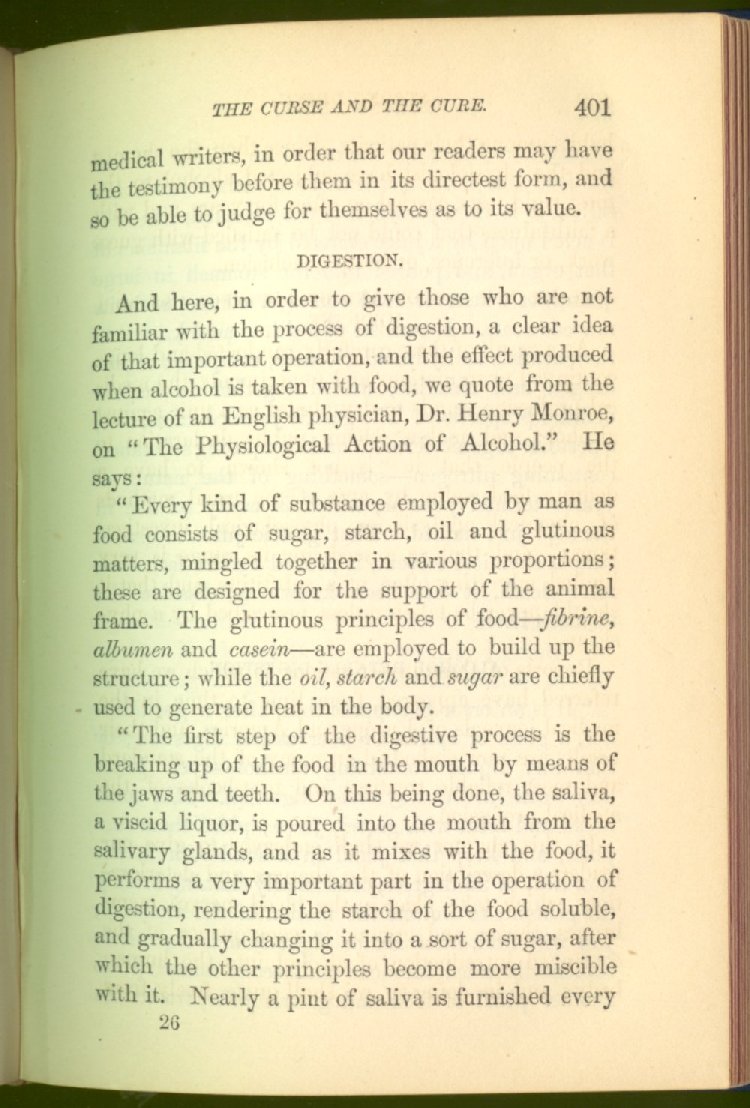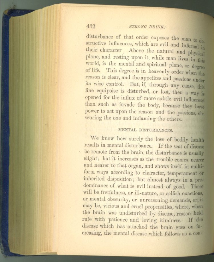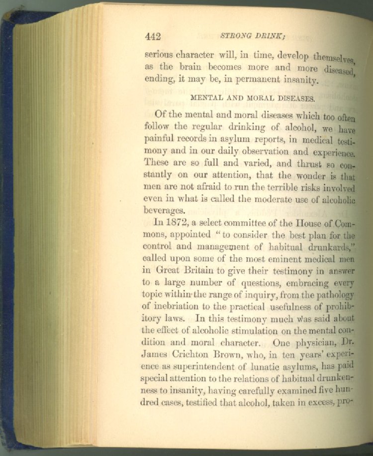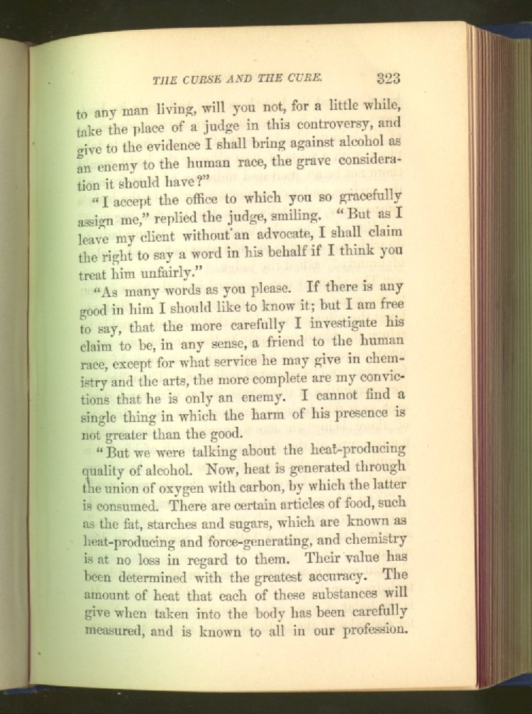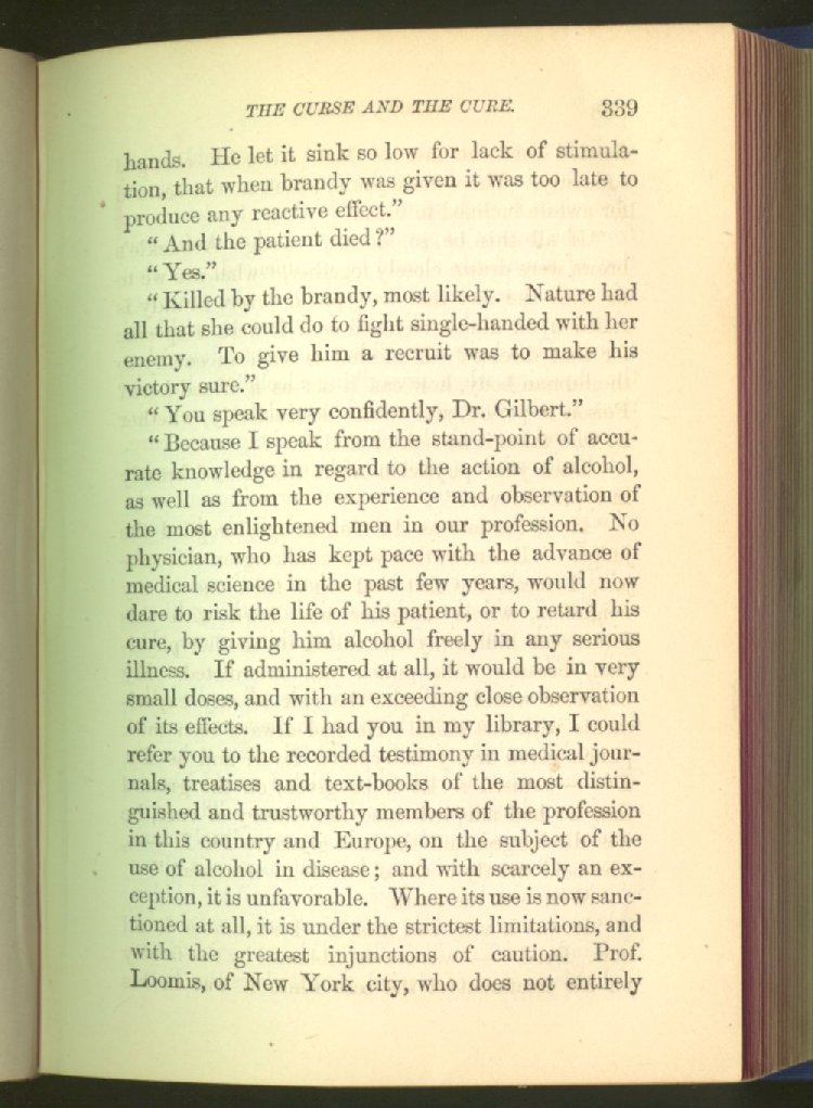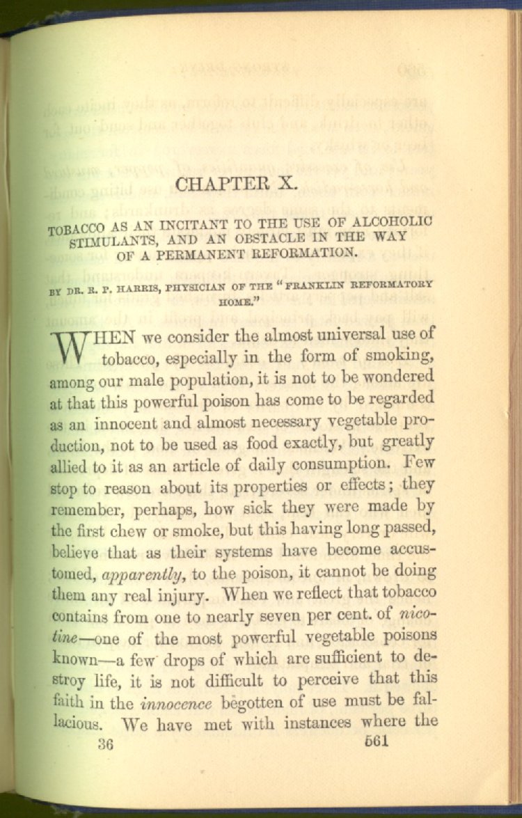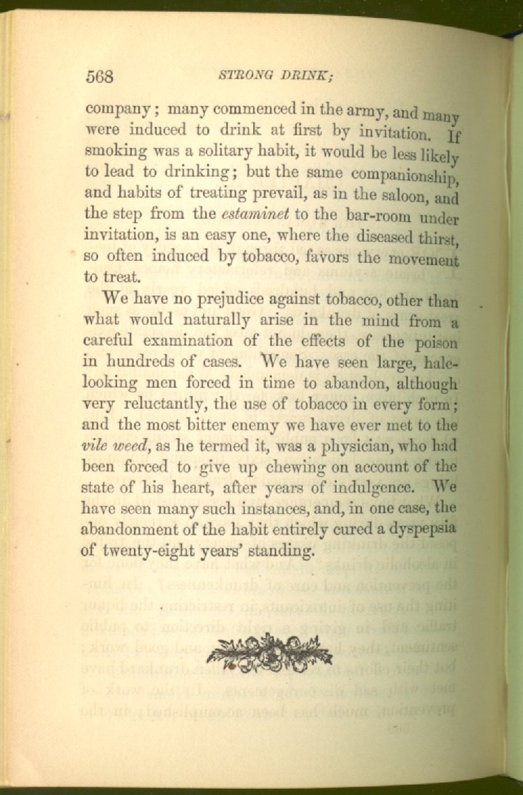 that he addresses himself to the more serious purpose of his work. It is because the majority of the people are ignorant of the specific action of alcohol on the nerves, membranes, blood-vessels and vital organs, that so many indulge in its use. Under this head he gives the latest and most carefully-conducted experiments of physiologists and scientists, from which it has been clearly demonstrated that alcohol invariably acts as a poison when taken into the body, and that its habitual use always lays the foundation for disease, often of a fatal character. This chapter is a most important one, and should be read by every young man, and by every moderate drinker in the land. Its well-authenticated statement cannot fail to arrest the reader's attention, and deeply impress him with the dangers that always attend the use of alcoholic drinks. It is also shown how mental failure always keeps pace with the physical deteriorations which attend the regular drinking of alcoholic beverages; that no man can do his best, mentally or physically, while under their influence, and that their continued use steadily lessens the intellectual vigor and blunts the moral faculties.