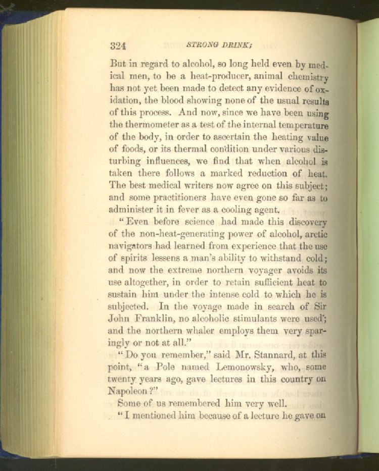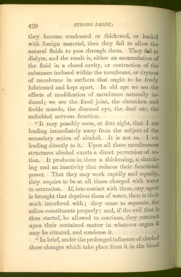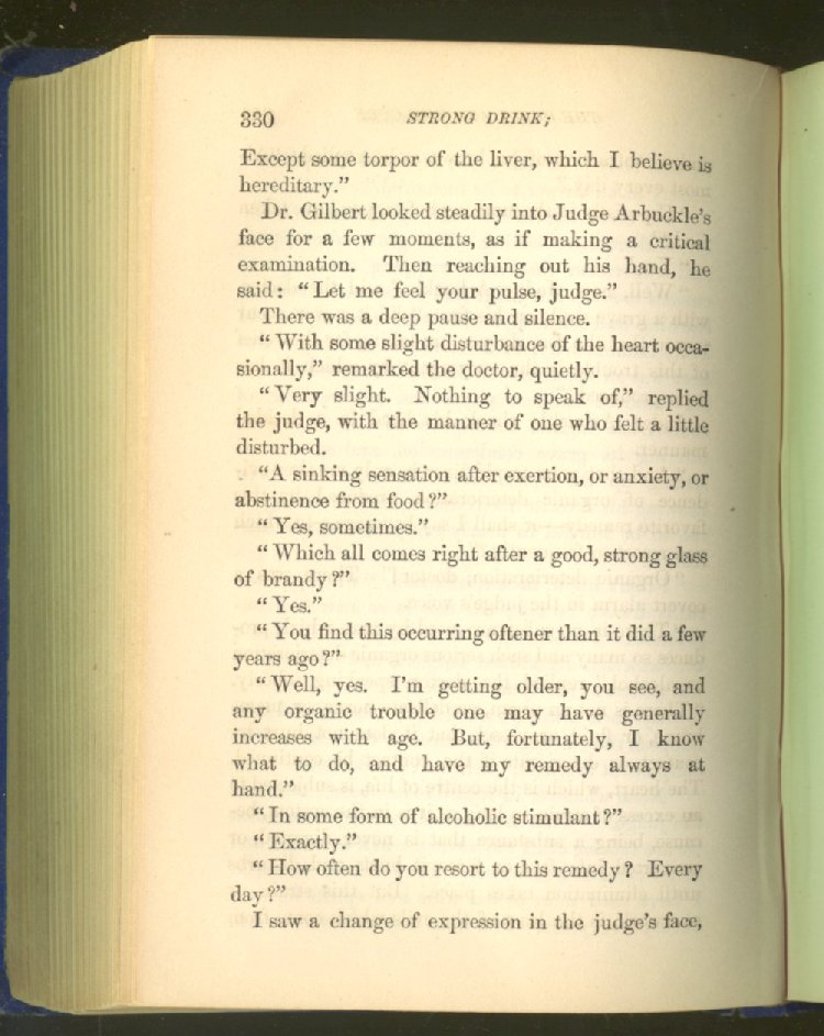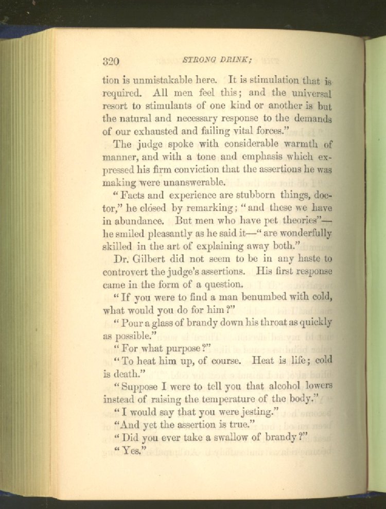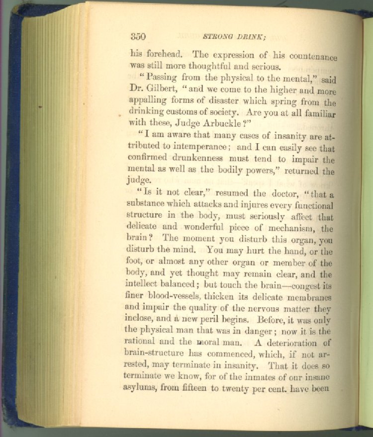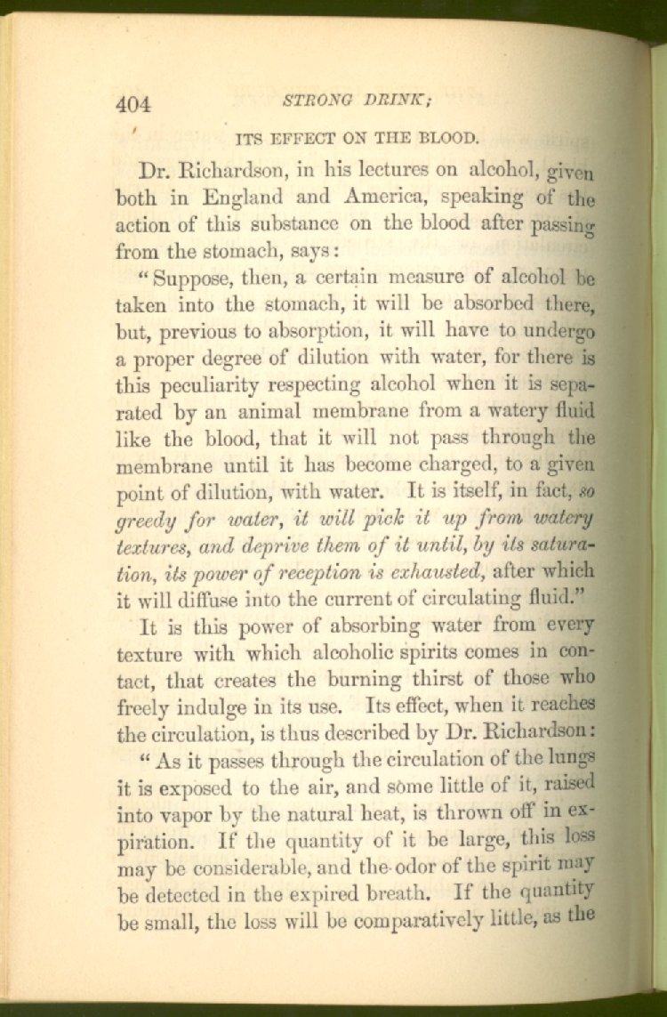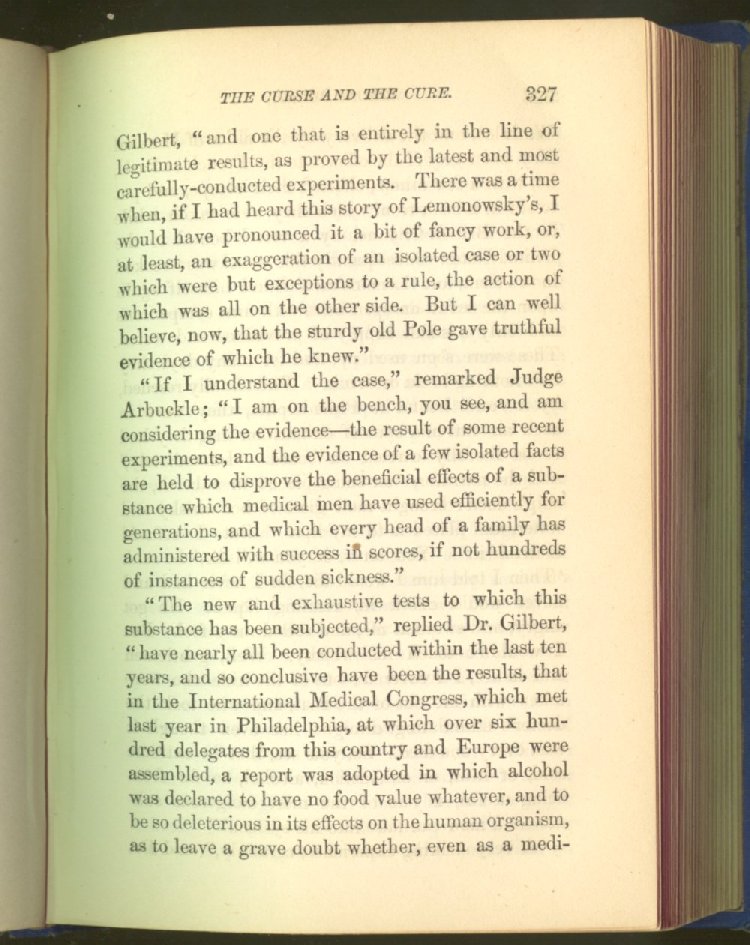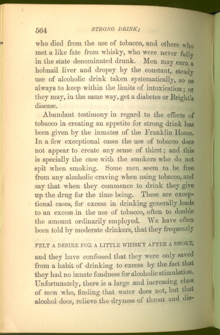 that he addresses himself to the more serious purpose of his work. It is because the majority of the people are ignorant of the specific action of alcohol on the nerves, membranes, blood-vessels and vital organs, that so many indulge in its use. Under this head he gives the latest and most carefully-conducted experiments of physiologists and scientists, from which it has been clearly demonstrated that alcohol invariably acts as a poison when taken into the body, and that its habitual use always lays the foundation for disease, often of a fatal character. This chapter is a most important one, and should be read by every young man, and by every moderate drinker in the land. Its well-authenticated statement cannot fail to arrest the reader's attention, and deeply impress him with the dangers that always attend the use of alcoholic drinks. It is also shown how mental failure always keeps pace with the physical deteriorations which attend the regular drinking of alcoholic beverages; that no man can do his best, mentally or physically, while under their influence, and that their continued use steadily lessens the intellectual vigor and blunts the moral faculties.