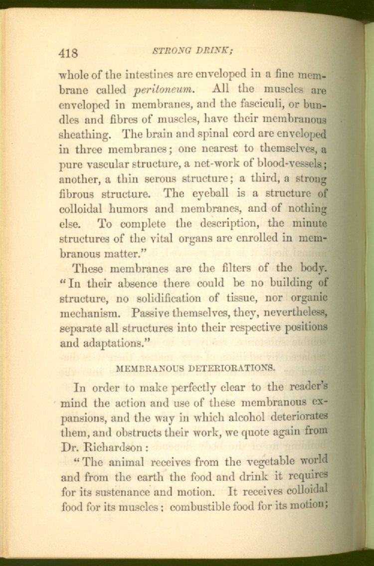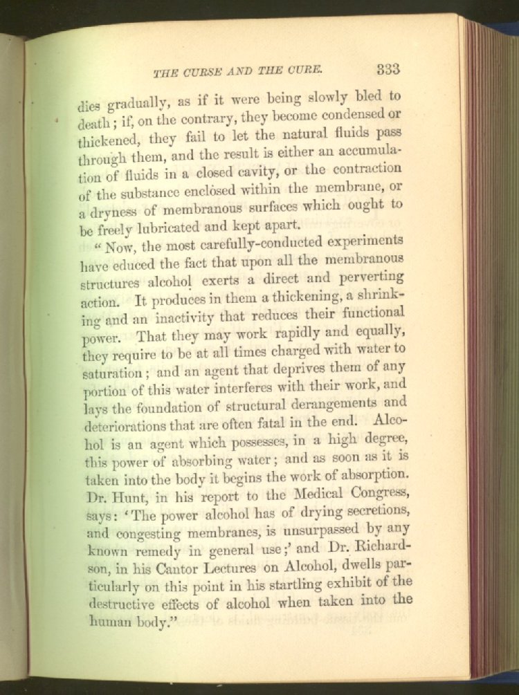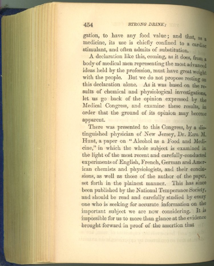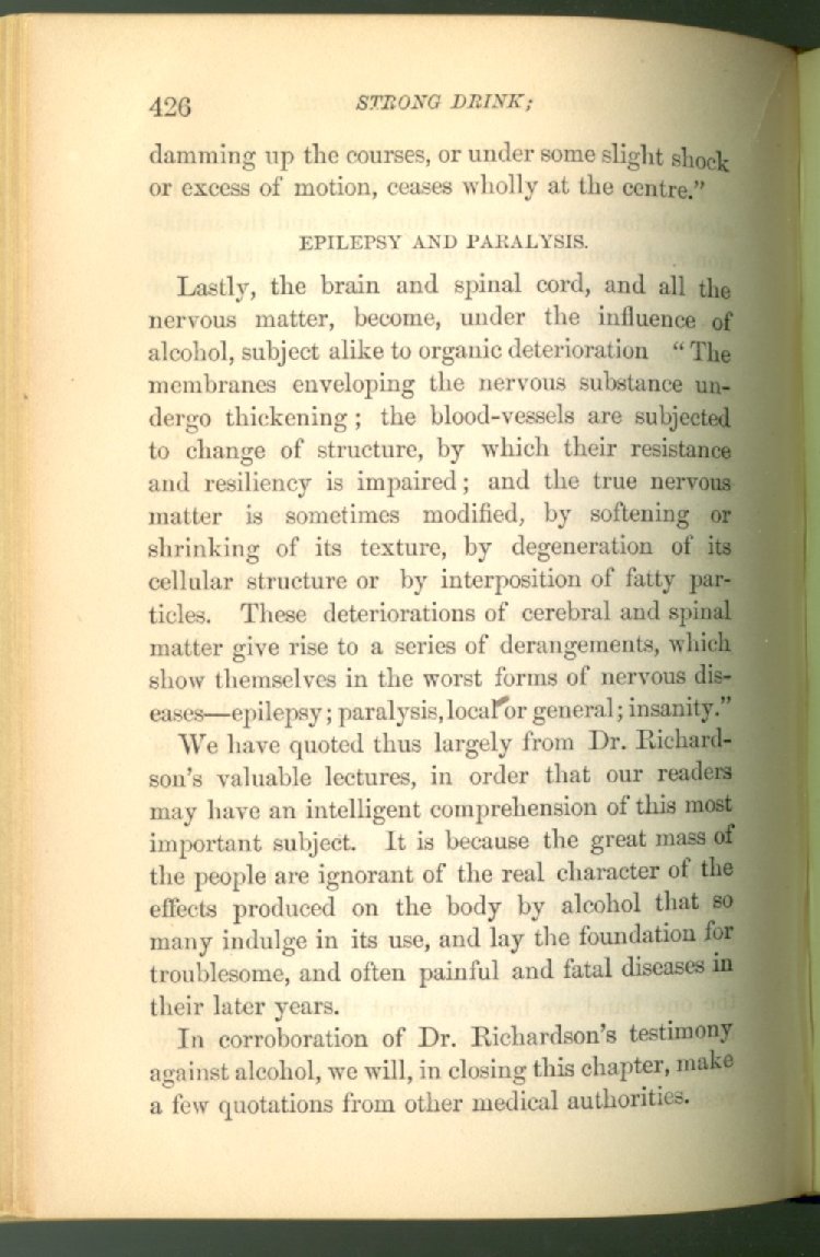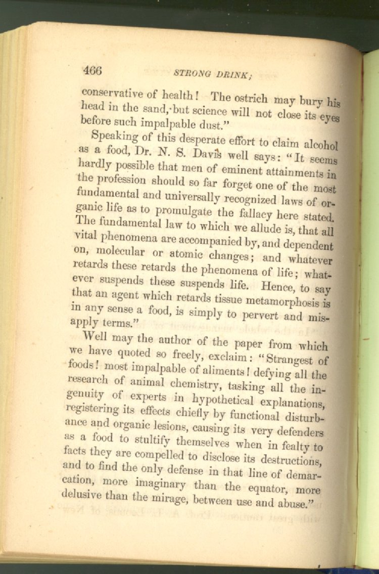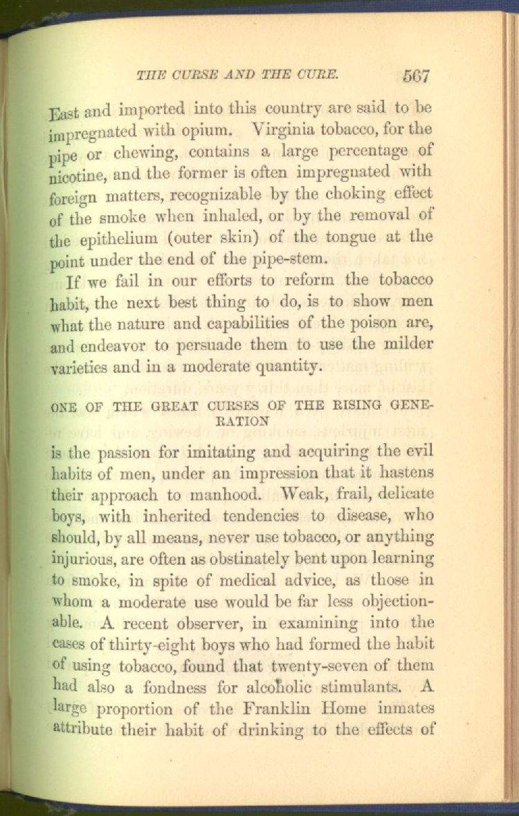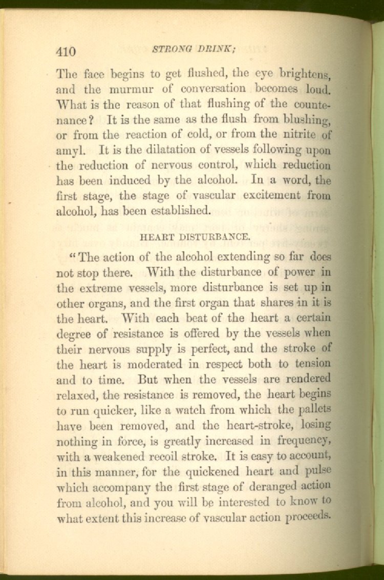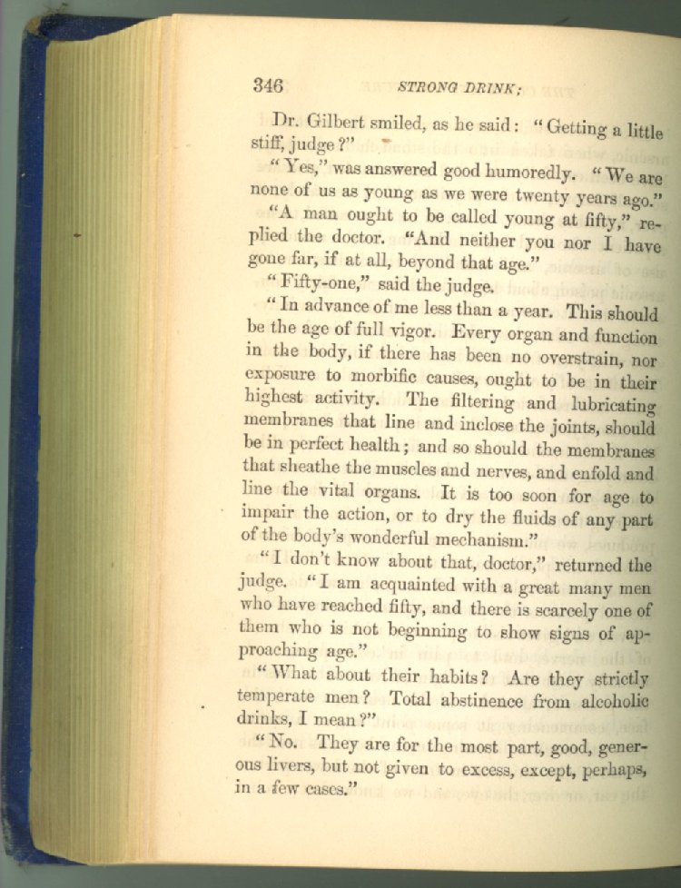 that he addresses himself to the more serious purpose of his work. It is because the majority of the people are ignorant of the specific action of alcohol on the nerves, membranes, blood-vessels and vital organs, that so many indulge in its use. Under this head he gives the latest and most carefully-conducted experiments of physiologists and scientists, from which it has been clearly demonstrated that alcohol invariably acts as a poison when taken into the body, and that its habitual use always lays the foundation for disease, often of a fatal character. This chapter is a most important one, and should be read by every young man, and by every moderate drinker in the land. Its well-authenticated statement cannot fail to arrest the reader's attention, and deeply impress him with the dangers that always attend the use of alcoholic drinks. It is also shown how mental failure always keeps pace with the physical deteriorations which attend the regular drinking of alcoholic beverages; that no man can do his best, mentally or physically, while under their influence, and that their continued use steadily lessens the intellectual vigor and blunts the moral faculties.