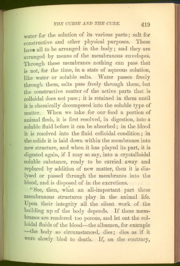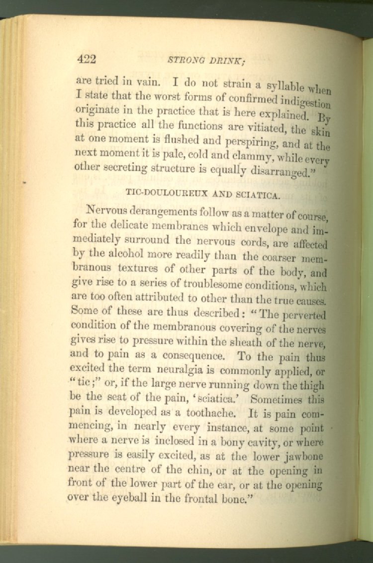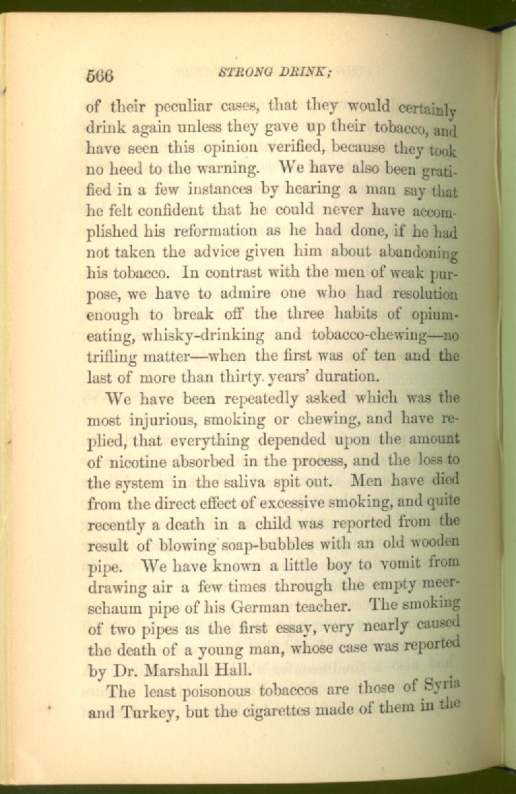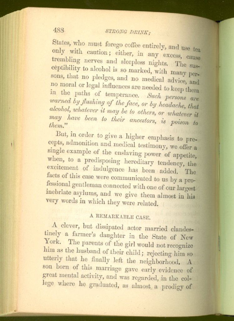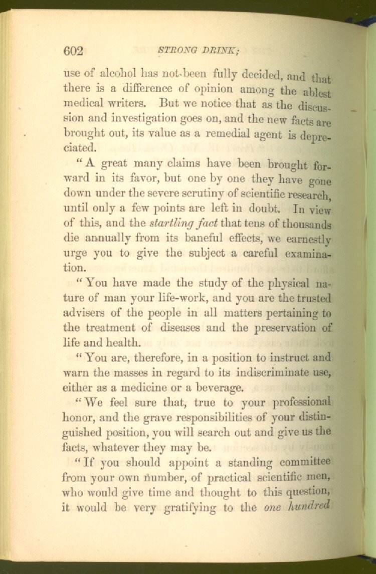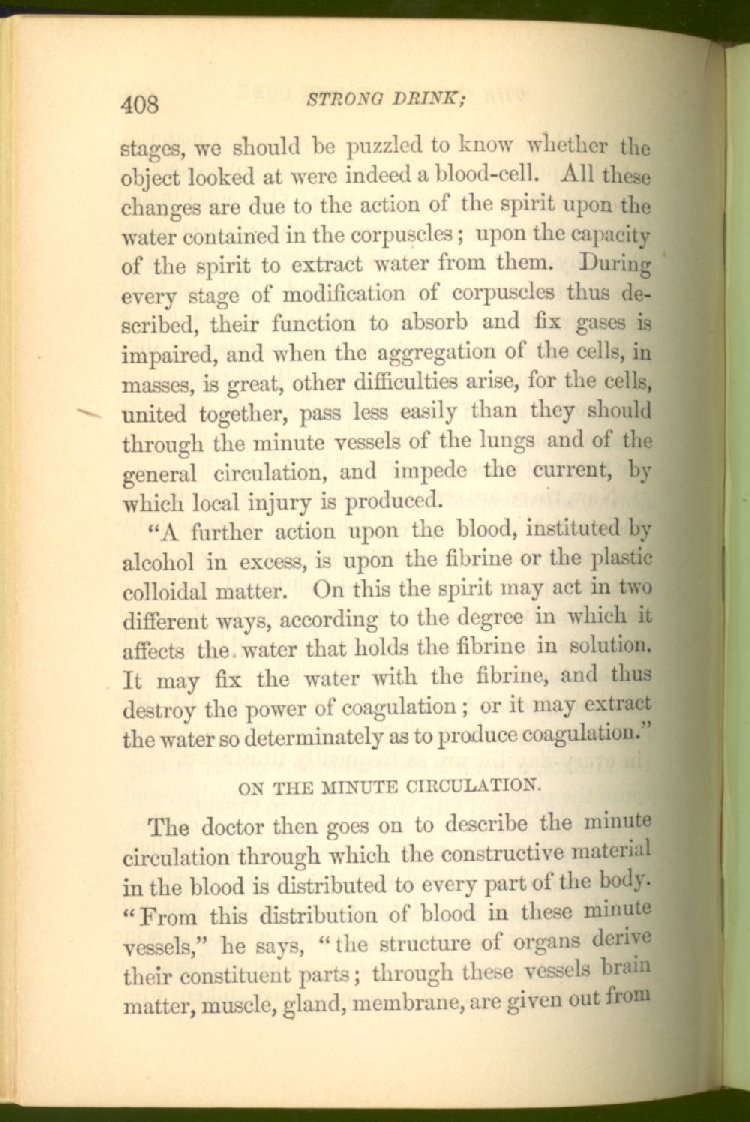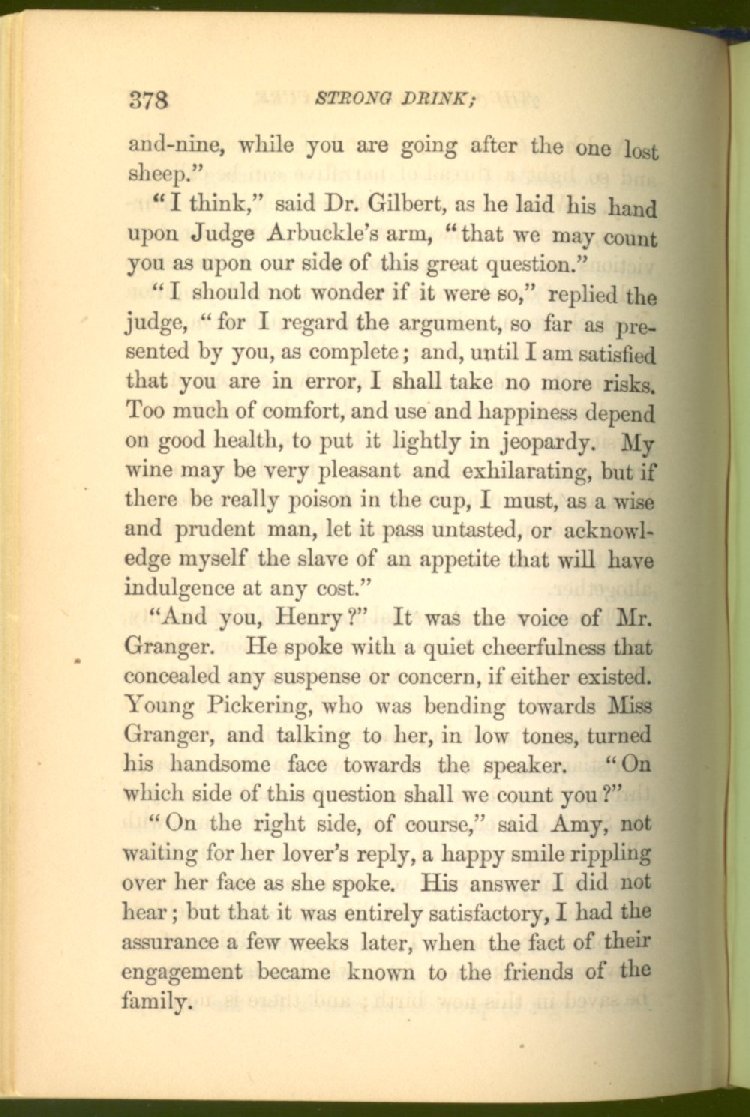 that he addresses himself to the more serious purpose of his work. It is because the majority of the people are ignorant of the specific action of alcohol on the nerves, membranes, blood-vessels and vital organs, that so many indulge in its use. Under this head he gives the latest and most carefully-conducted experiments of physiologists and scientists, from which it has been clearly demonstrated that alcohol invariably acts as a poison when taken into the body, and that its habitual use always lays the foundation for disease, often of a fatal character. This chapter is a most important one, and should be read by every young man, and by every moderate drinker in the land. Its well-authenticated statement cannot fail to arrest the reader's attention, and deeply impress him with the dangers that always attend the use of alcoholic drinks. It is also shown how mental failure always keeps pace with the physical deteriorations which attend the regular drinking of alcoholic beverages; that no man can do his best, mentally or physically, while under their influence, and that their continued use steadily lessens the intellectual vigor and blunts the moral faculties.