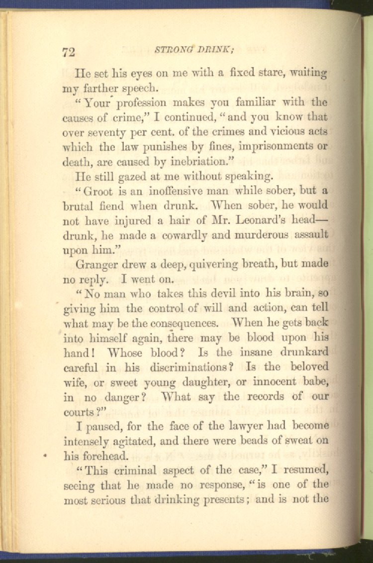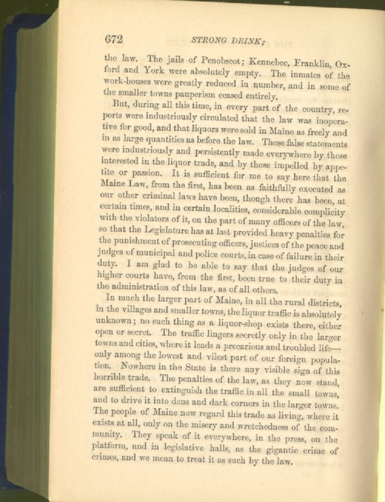 In much the larger part of Maine, in all the rural districts, in the villages and smaller towns, the liquor traffic is absolutely unknown; no such thing as a liquor-shop exists there, either open or secret. The traffic lingers secretly only in the larger towns and cities, where it leads a precarious and troubled life--only among the lowest and vilest part of our foreign population. Nowhere in the State is there any visible sign of this horrible trade. The penalties of the law, as they now stand, are sufficient to extinguish the traffic in all the small towns, and to drive it into dens and dark corners in the larger towns. The people of Maine now regard this trade as living, where it exists at all, only on the misery and wretchedness of the community. They speak of it everywhere, in the press, on the platform, and in legislative halls, as the gigantic crime of crimes, and we mean to treat it as such by the law.