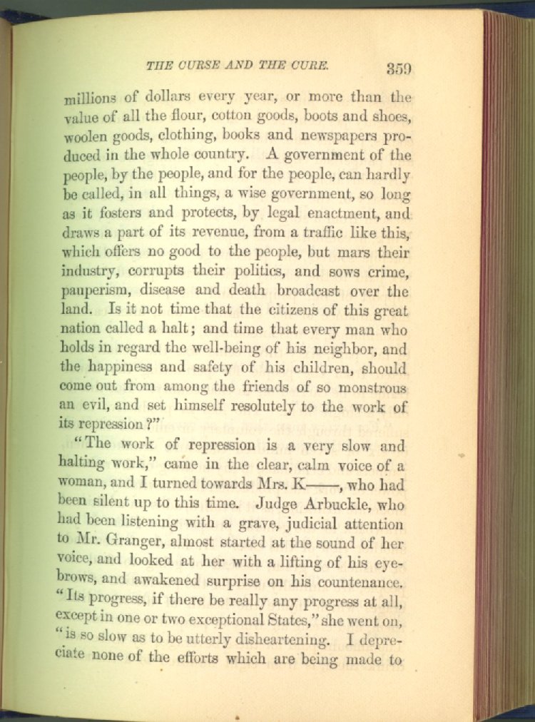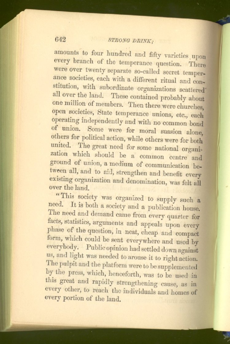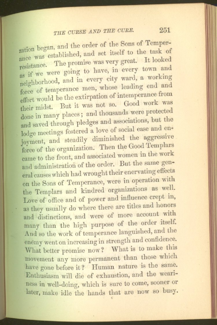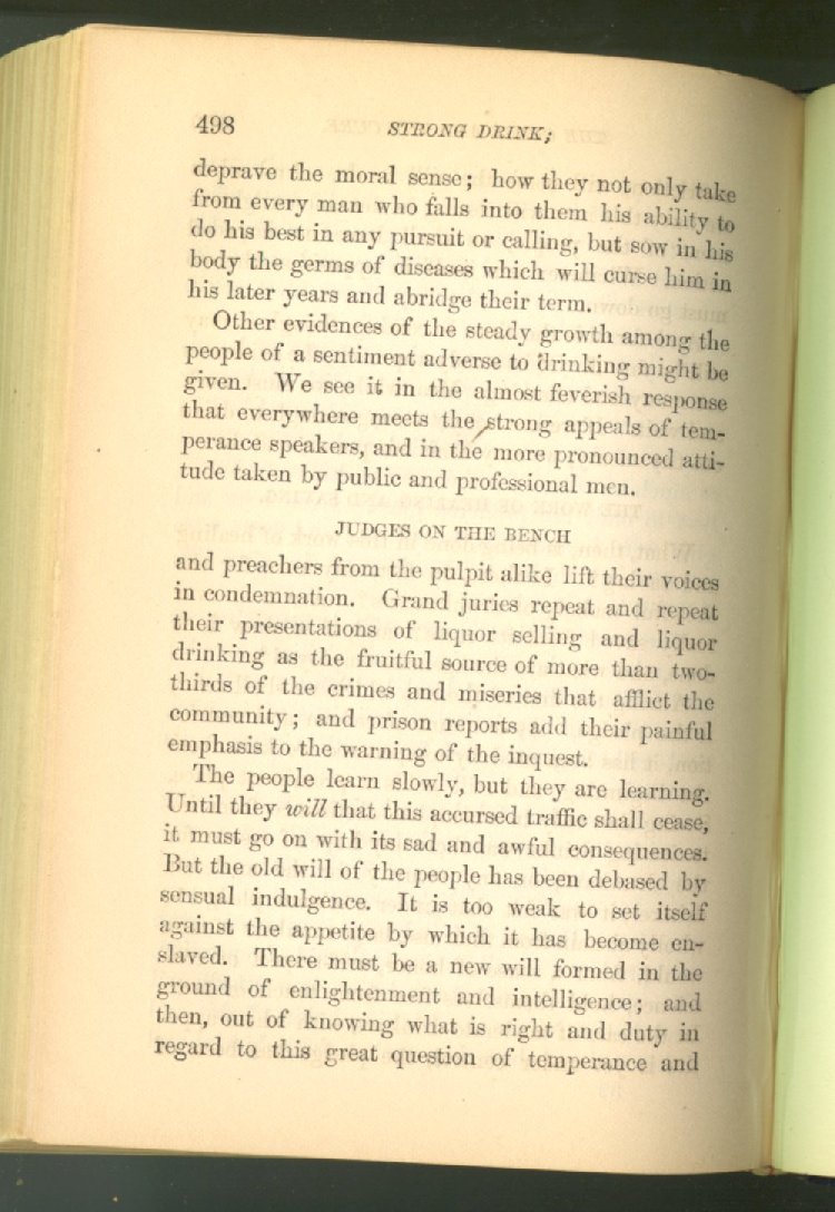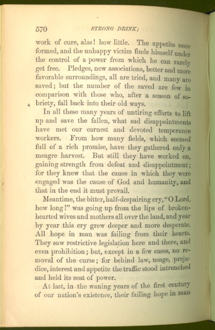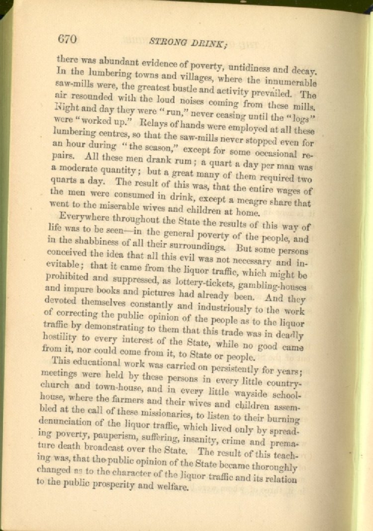 Everywhere throughout the State the results of this way of life was to be seen--in the general poverty of the people, and in the shabbiness of all their surroundings. But some persons conceived the idea that all this evil was not necessary and inevitable; that it came from the liquor traffic, which might be prohibited and suppressed, as lottery-tickets, gambling-houses and impure books and pictures had already been. And they devoted themselves constantly and industriously to the work of correcting the public opinion of the people as to the liquor traffic by demonstrating to them that this trade was in deadly hostility to every interest of the State, while no good came from it, nor could come from it, to State or people.