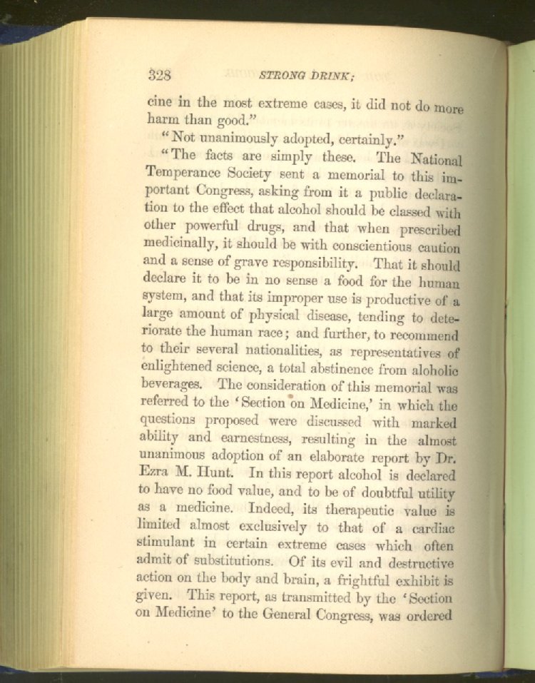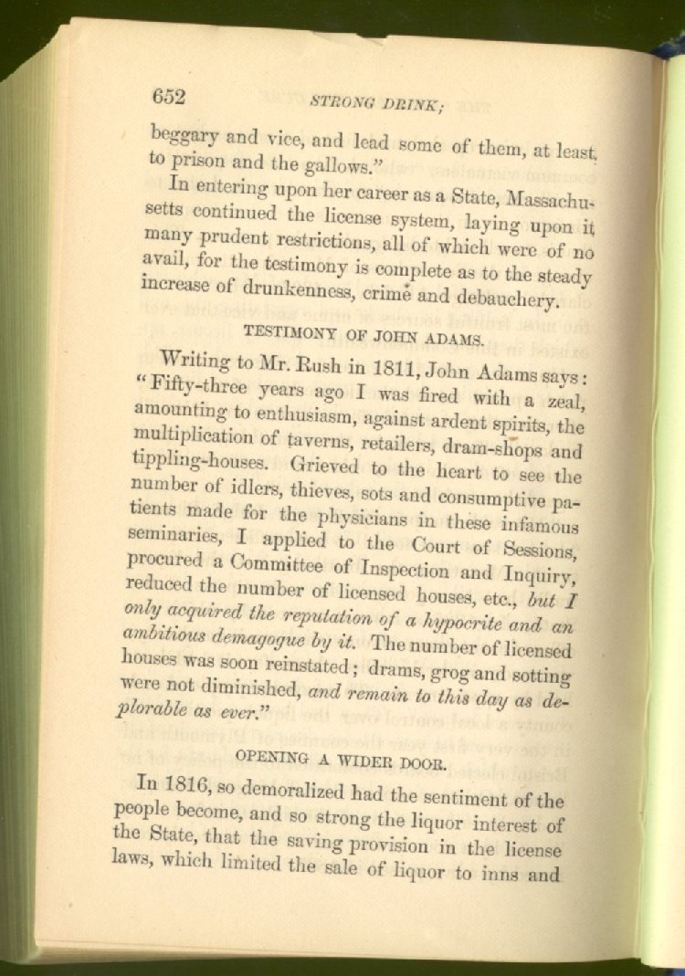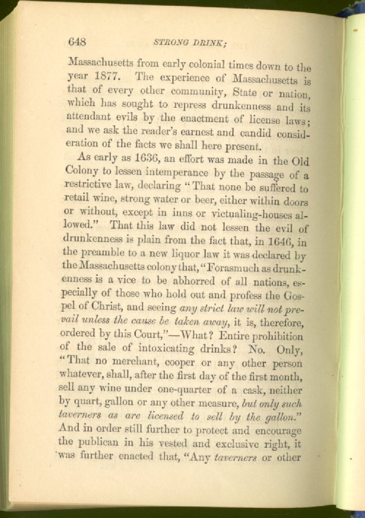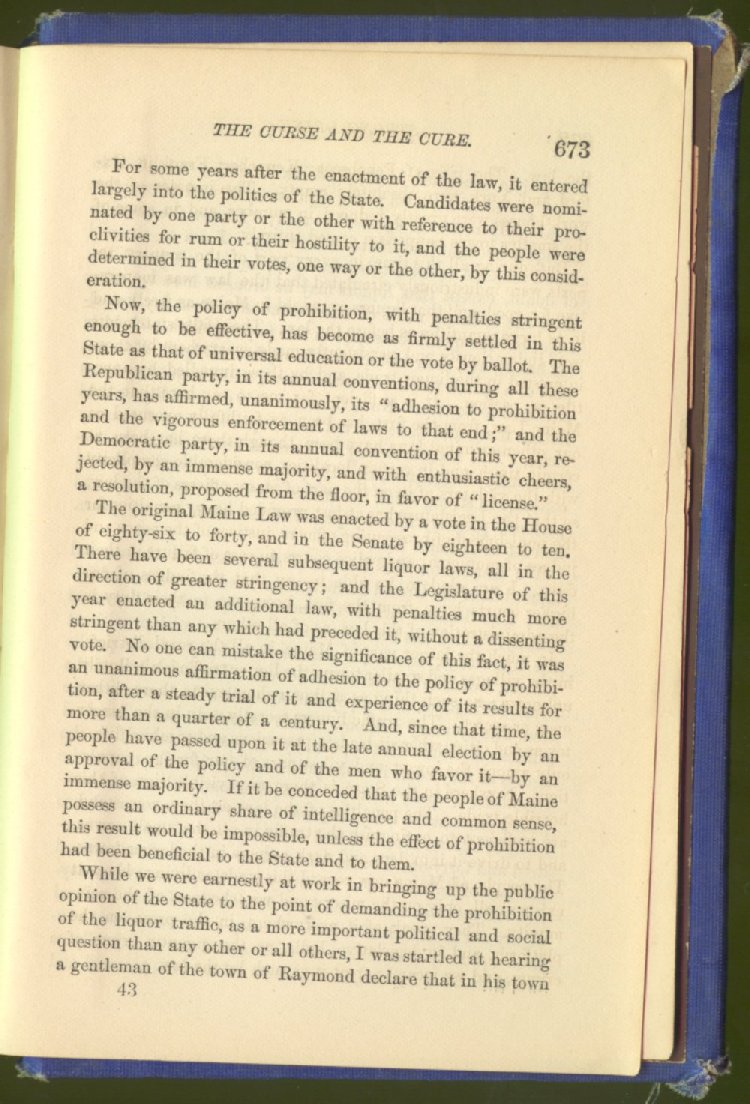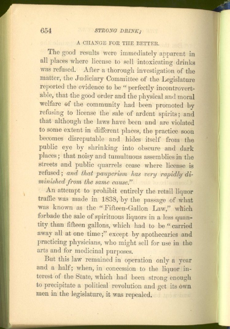 When we thought the time had come for it, we demanded of the Legislature that the law of "license," then upon the statute books, which represented the public opinion of the old time, should be changed for a law of prohibition, representing the improved public opinion of the present time; and, after two unsuccessful attempts to procure such a law, we obtained what we desired, an act of absolute prohibition to the manufacture and sale of strong drink--a measure for which we had labored long and industriously for many years.