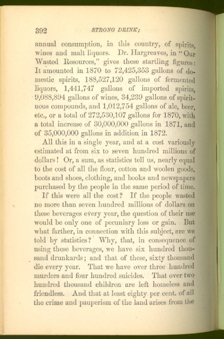 the people consumed in strong drink its entire valuation in every period of eighteen years, eight months and twenty-five days! "Here are the figures," he said; "I know the quantity of liquor brought into the town annually. I am so situated that I am able to state this accurately, beyond all possibility of doubt, except that liquors may be brought here by other than the ordinary mode of transportation without my knowledge; but the quantities stated in this paper (which he held in his hand), and their cost are within my knowledge." This was part of a speech to his fellow-townsmen, and his statement was admitted to be true. Now, there is not a drop of liquor sold in that town, and there has not been any sold there for many years. This statement may strike us at first blush to be tremendously exaggerated, that the people of any locality should consume in strong drink the entire value of its real estate and personal property in every period of less than twenty years. But let us examine it.