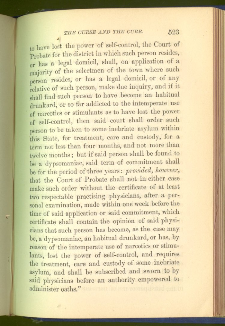 In Meriden, the chaplain of the reform school testified that "crime had diminished seventy-five per cent." In New London, the jail was tenantless. In Norwich, the jails and almshouses were reported "as almost empty." But in 1873, the liquor influence was strong enough in the legislature to substitute