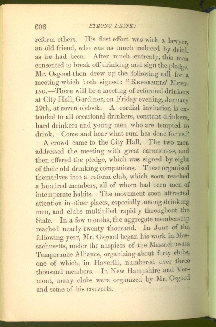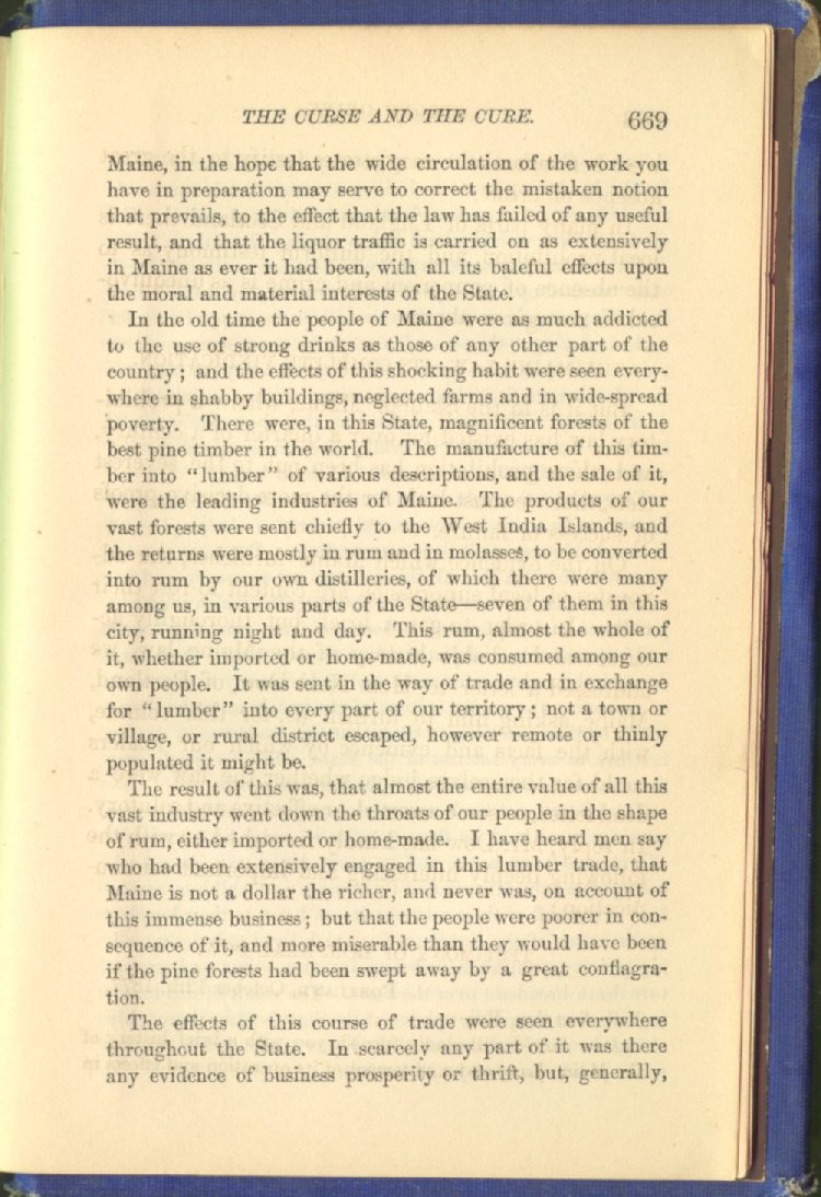 In the old time the people of Maine were as much addicted to the use of strong drinks as those of any other part of the country; and the effects of this shocking habit were seen everywhere in shabby buildings, neglected farms and in wide-spread poverty. There were, in this State, magnificent forests of the best pine timber in the world. The manufacture of this timber into "lumber" of various descriptions, and the sale of it, were the leading industries of Maine. The products of our vast forests were sent chiefly to the West India Islands, and the returns were mostly in rum and in molasses, to be converted into rum by our own distilleries, of which there were many among us, in various parts of the State--seven of them in this city, running night and day. This rum, almost the whole of it, whether imported or home-made, was consumed among our own people. It was sent in the way of trade and in exchange for "lumber" into every part of our territory; not a town or village, or rural district escaped, however remote or thinly populated it might be.