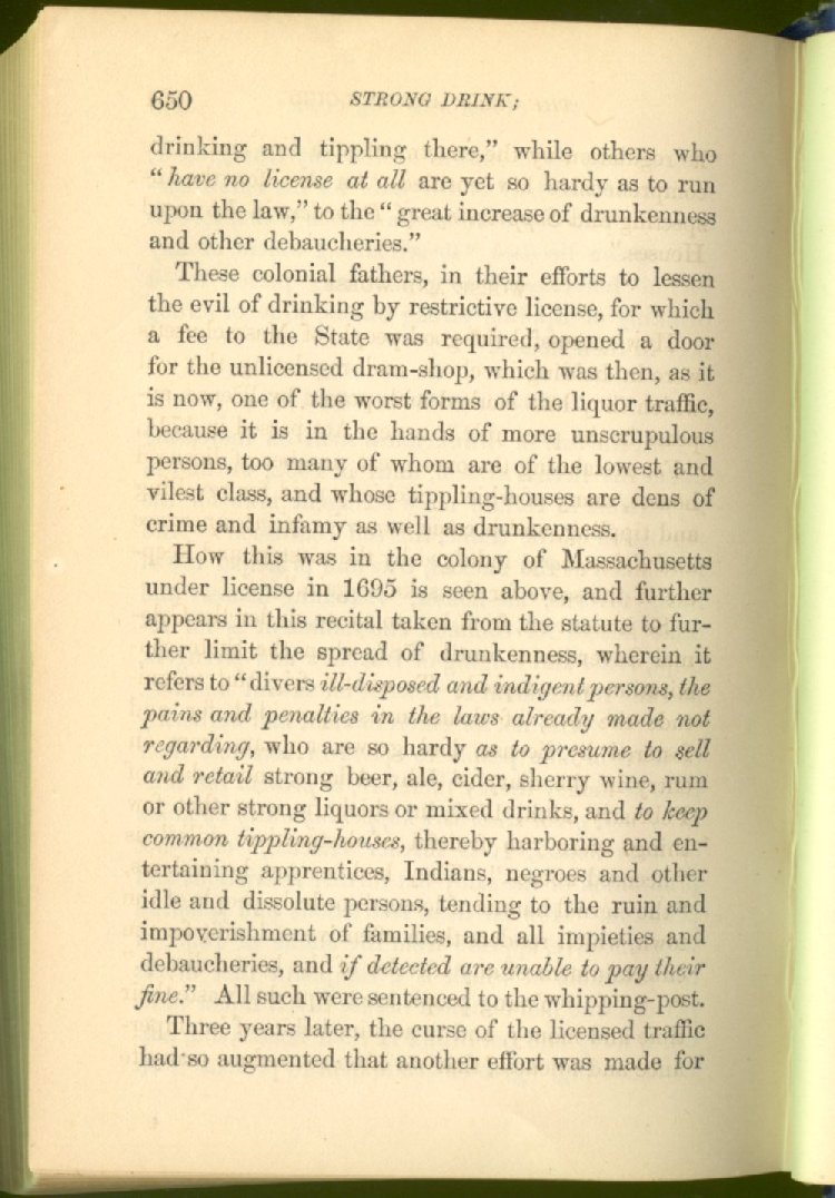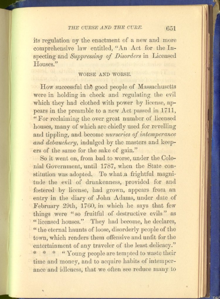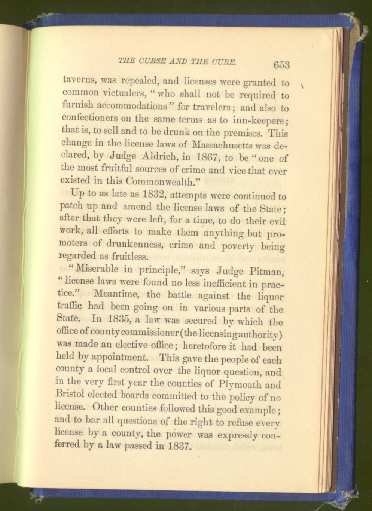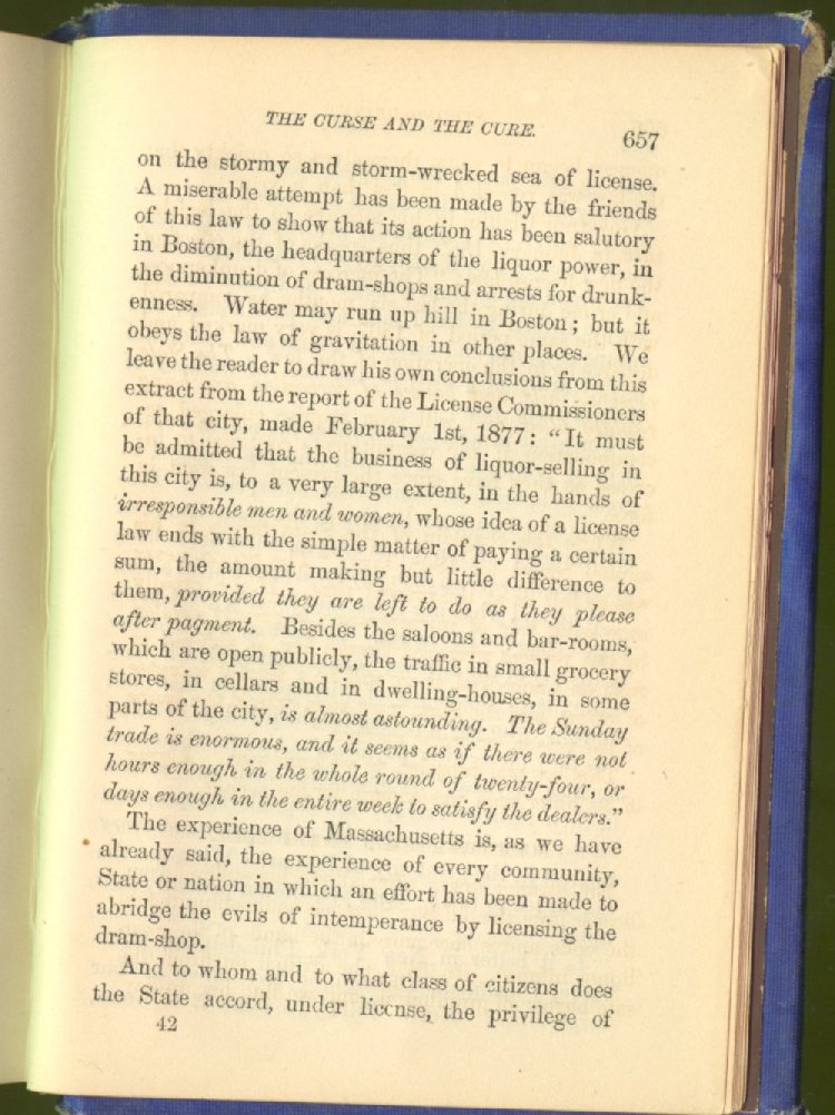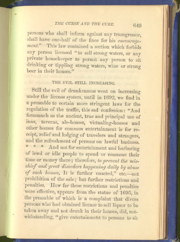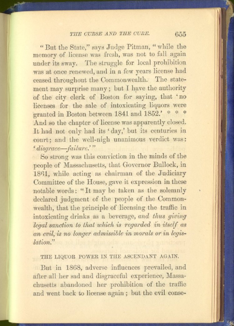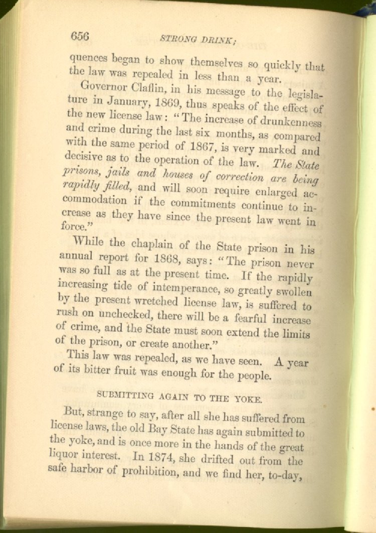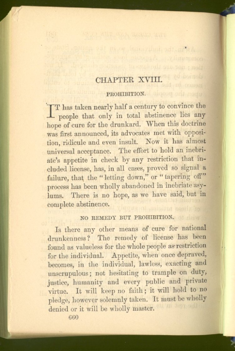 license for prohibition. The consequence was an immediate increase of drunkenness and crime. Two years afterwards, the Secretary of State declared that "there was a greater increase of crime in one year under license than in seven years under prohibition."