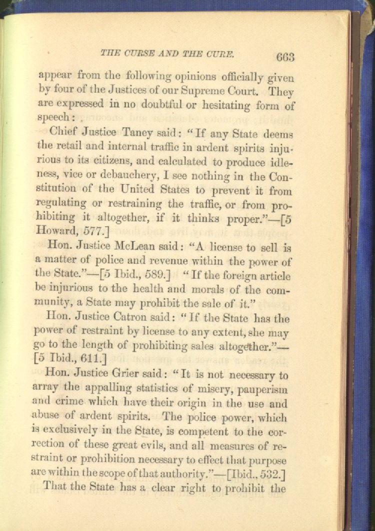 Chief Justice Taney said: "If any State deems the retail and internal traffic in ardent spirits injurious to its citizens, and calculated to produce idleness, vice or debauchery, I see nothing in the Constitution of the United States to prevent it from regulating or restraining the traffic, or from prohibiting it altogether, if it thinks proper."--[5 Howard, 577.]