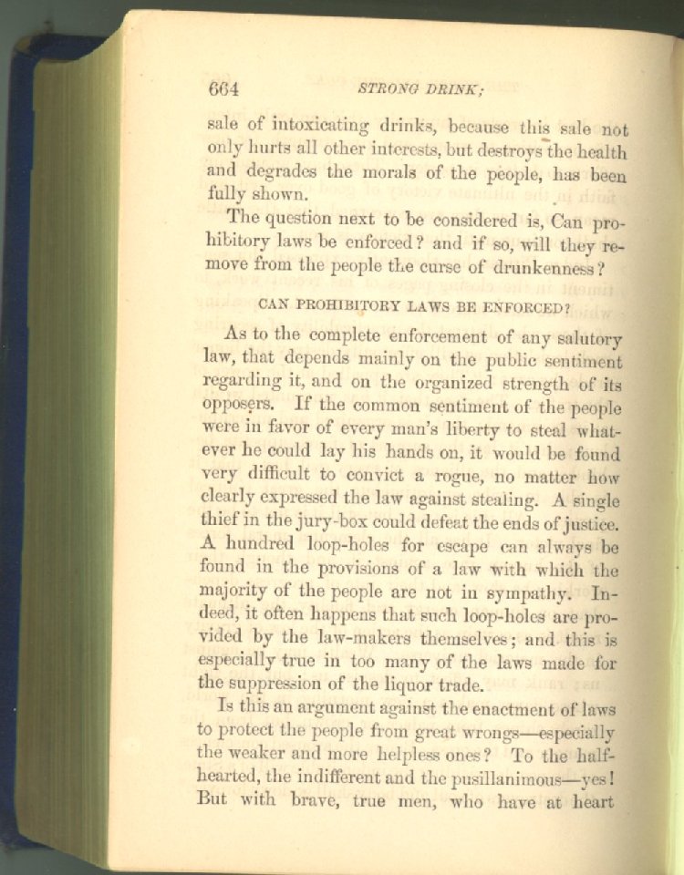 As to the complete enforcement of any salutory law, that depends mainly on the public sentiment regarding it, and on the organized strength of its opposers. If the common sentiment of the people were in favor of every man's liberty to steal whatever he could lay his hands on, it would be found very difficult to convict a rogue, no matter how clearly expressed the law against stealing. A single thief in the jury-box could defeat the ends of justice. A hundred loop-holes for escape can always be found in the provisions of a law with which the majority of the people are not in sympathy. Indeed, it often happens that such loop-holes are provided by the law-makers themselves; and this is especially true in too many of the laws made for the suppression of the liquor trade.