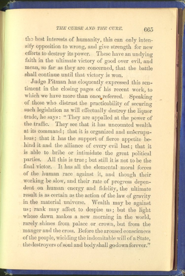 Judge Pitman has eloquently expressed this sentiment in the closing pages of his recent work, to which we have more than once referred. Speaking of those who distrust the practicability of securing such legislation as will effectually destroy the liquor trade, he says: "They are appalled at the power of the traffic. They see that it has uncounted wealth at its command; that it is organized and unscrupulous; that it has the support of fierce appetite behind it and the alliance of every evil lust; that it is able to bribe or intimidate the great political parties. All this is true; but still it is not to be the final victor. It has all the elemental moral forces of the human race against it, and though their working be slow, and their rate of progress dependent on human energy and fidelity, the ultimate result is as certain as the action of the law of gravity in the material universe. Wealth may be against us; rank may affect to despise us; but the light whose dawn makes a new morning in the world, rarely shines from palace or crown, but from the manger and the cross. Before the aroused consciences of the people, wielding the indomitable will of a State, the destroyers of soul and body shall go down forever."