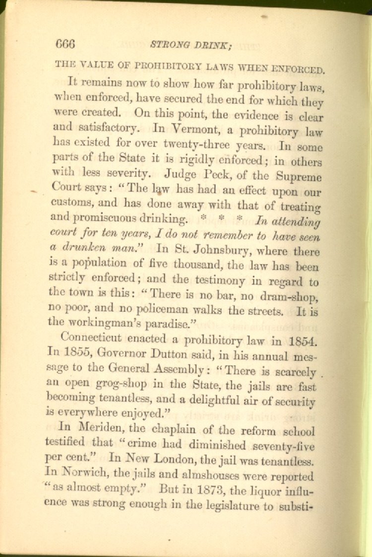 It remains now to show how far prohibitory laws, when enforced, have secured the end for which they were created. On this point, the evidence is clear and satisfactory. In Vermont, a prohibitory law has existed for over twenty-three years. In some parts of the State it is rigidly enforced; in others with less severity. Judge Peck, of the Supreme Court says: "The law has had an effect upon our customs, and has done away with that of treating and promiscuous drinking. * * *