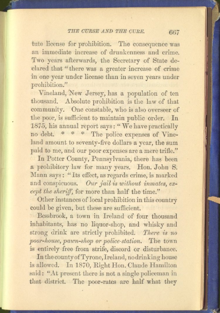 Vineland, New Jersey, has a population of ten thousand. Absolute prohibition is the law of that community. One constable, who is also overseer of the poor, is sufficient to maintain public order. In 1875, his annual report says: "We have practically no debt. * * * The police expenses of Vineland amount to seventy-five dollars a year, the sum paid to me, and our poor expenses are a mere trifle."