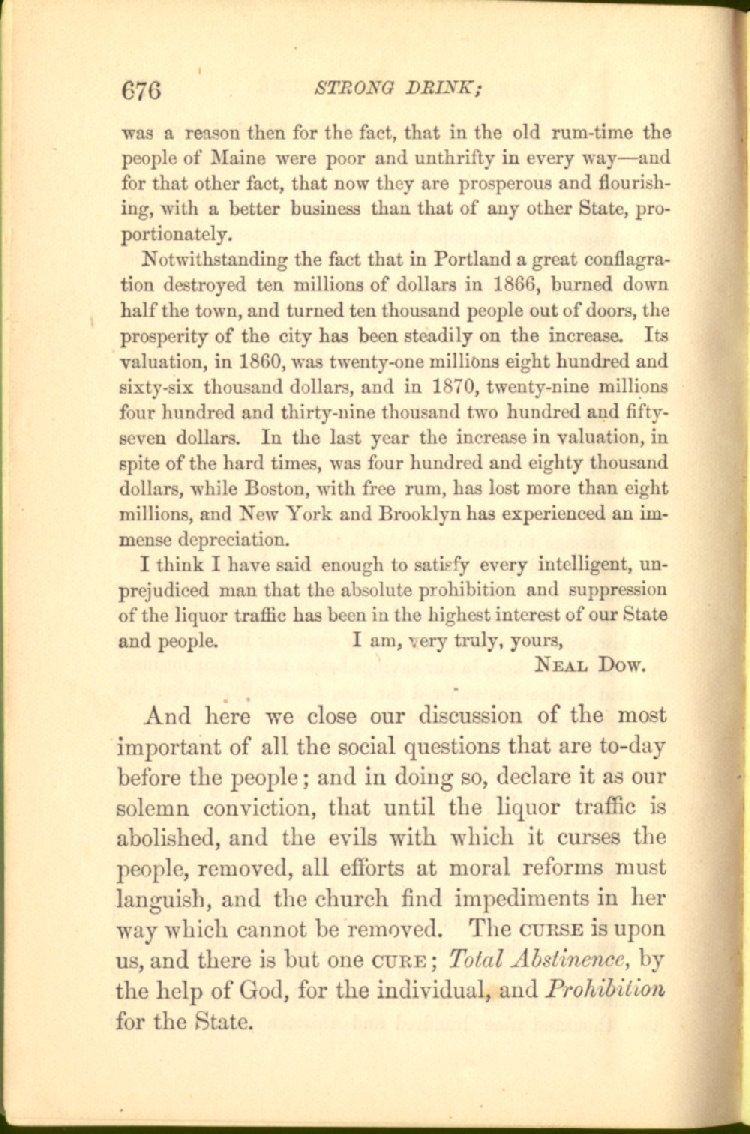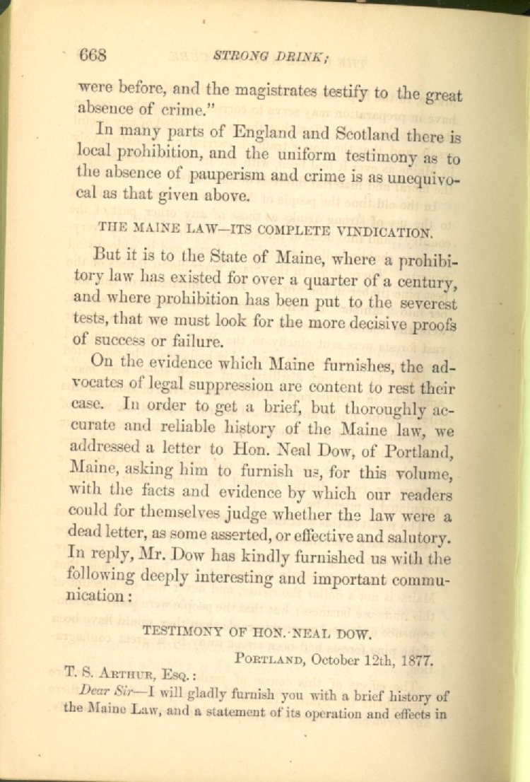 On the evidence which Maine furnishes, the advocates of legal suppression are content to rest their case. In order to get a brief, but thoroughly accurate and reliable history of the Maine law, we addressed a letter to Hon. Neal Dow, of Portland, Maine, asking him to furnish us, for this volume, with the facts and evidence by which our readers could for themselves judge whether the law were a dead letter, as some asserted, or effective and salutory. In reply, Mr. Dow has kindly furnished us with the following deeply interesting and important communication: