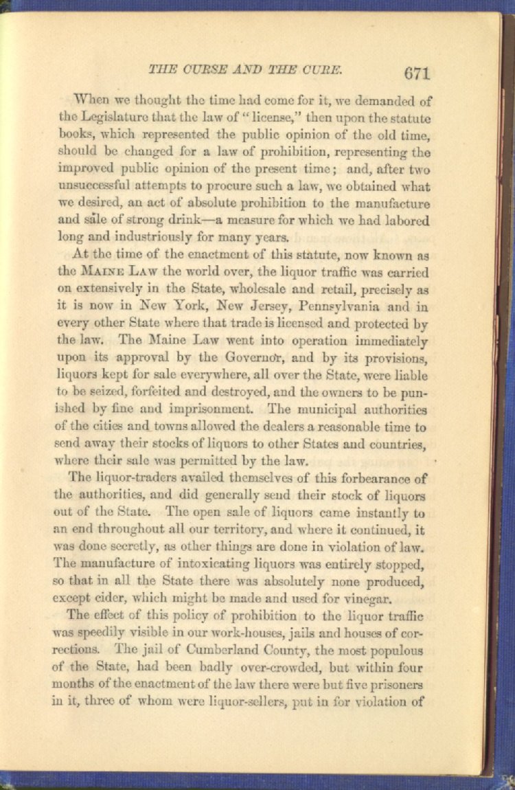 The effect of this policy of prohibition to the liquor traffic was speedily visible in our work-houses, jails and houses of corrections. The jail of Cumberland County, the most populous of the State, had been badly over-crowded, but within four months of the enactment of the law there were but five prisoners in it, three of whom were liquor-sellers, put in for violation of