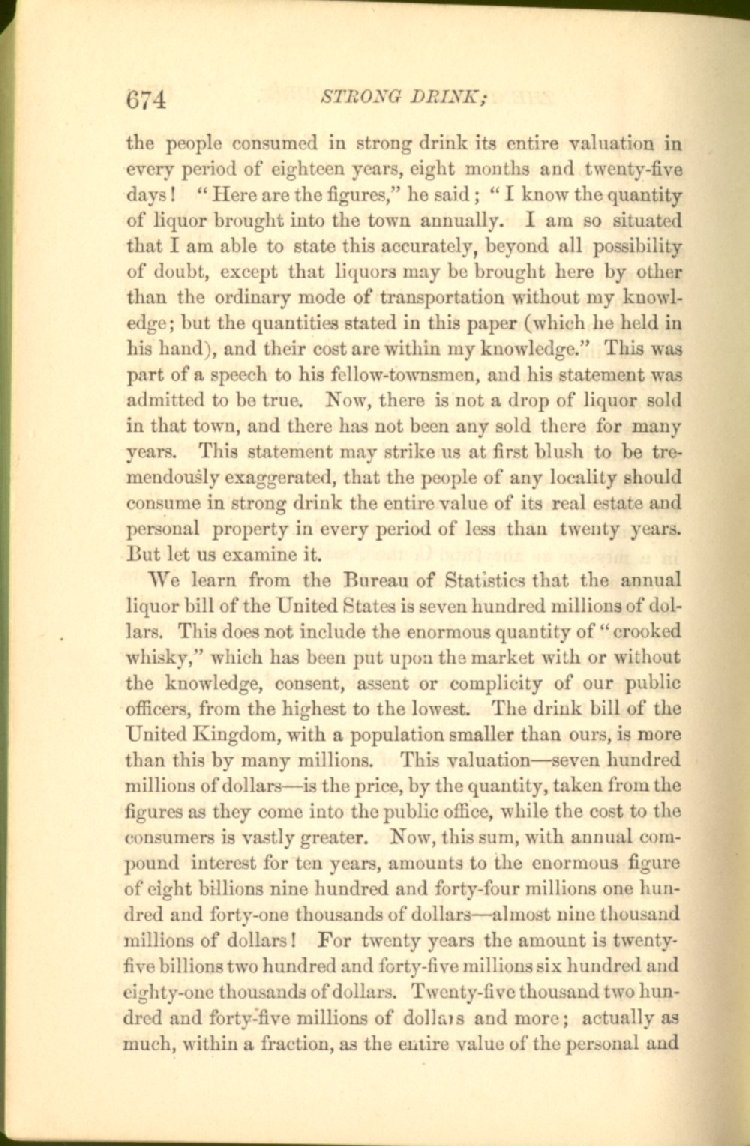 We learn from the Bureau of Statistics that the annual liquor bill of the United States is seven hundred millions of dollars. This does not include the enormous quantity of "crooked whisky," which has been put upon the market with or without the knowledge, consent, assent or complicity of our public officers, from the highest to the lowest. The drink bill of the United Kingdom, with a population smaller than ours, is more than this by many millions. This valuation--seven hundred millions of dollars--is the price, by the quantity, taken from the figures as they come into the public office, while the cost to the consumers is vastly greater. Now, this sum, with annual compound interest for ten years, amounts to the enormous figure of eight billions nine hundred and forty-four millions one hundred and forty-one thousands of dollars--almost nine thousand millions of dollars! For twenty years the amount is twenty-five billions two hundred and forty-five millions six hundred and eighty-one thousands of dollars. Twenty-five thousand two hundred and forty-five millions of dollars and more; actually as much, within a fraction, as the entire value of the personal and