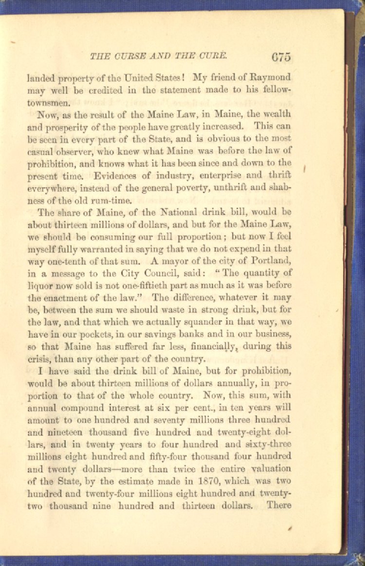 The share of Maine, of the National drink bill, would be about thirteen millions of dollars, and but for the Maine Law, we should be consuming our full proportion; but now I feel myself fully warranted in saying that we do not expend in that way one-tenth of that sum. A mayor of the city of Portland, in a message to the City Council, said: "The quantity of liquor now sold is not one-fiftieth part as much as it was before the enactment of the law." The difference, whatever it may be, between the sum we should waste in strong drink, but for the law, and that which we actually squander in that way, we have in our pockets, in our savings banks and in our business, so that Maine has suffered far less, financially during this crisis, than any other part of the country.